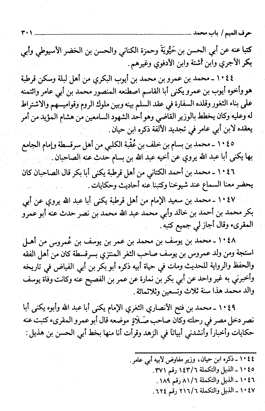 1045 - مُحَمَّد بْن بسام بْن خَلَف بْن عُقْبة الْكَلْبِيّ من أَهْل سرقسطة وَإِمَام الْجَامِع بهَا يكنى أَبَا عَبْد اللَّه يروي عَنْ أَخِيه عَبْد اللَّه بْن بسام حدَّث عَنْهُ الصاحبان