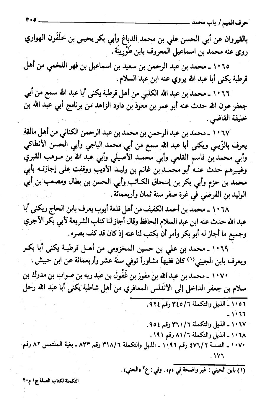 1067 - مُحَمَّد بن عبد الرَّحْمَن بن مُحَمَّد بْن عَبْد الرَّحْمَن الكِنَانيّ من أَهْل مالقة يعرف بالزّيي ويكنى أَبَا عَبْد اللَّه سَمِعَ من أبي مُحَمَّد الْبَاجِيّ وَأبي الْحَسَن الْأَنْطَاكِي وَأبي مُحَمَّد بْن قَاسم القلعي وَأبي مُحَمَّد الْأصيلِيّ وَأبي عَبْد اللَّه بْن موهب القبري وَغَيرهم حدَّث عَنْهُ أَبُو مُحَمَّد بْن غَانِم بْن وليد الأديب ووقفت عَلَى إِجَازَته بِأبي مُحَمَّد بْن حزم وَأبي بَكْر بْن إِسْحَاق الْكَاتِب وَأبي الْحَسَن بْن بطال وَمصْعَب بْن أبي الْوَلِيد بْن الفَرَضيّ فِي غرَّة صَفَر سنة ثَمَان وَأَرْبَعمِائَة