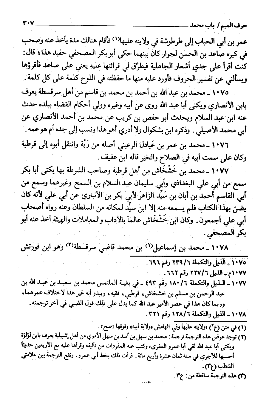 1077 - مُحَمَّد بْن خَشْخَاش من أَهْل قرطبة وَصَاحب الشرطة بهَا يكنى أَبَا بَكْر سمع من أبي عَليّ الْبَغْدَادِيّ وَأبي سُلَيْمَان عبد السَّلَام بن السَّمْح وَغَيرهمَا وَسمع من أبي القَاسِم أَحْمَد بْن أبان بْن سَيِّد الزَّاهِر لأبي بَكْر بْن الأنبَاريّ عَنْ أبي عَلِيّ لِأَنَّهُ كَانَ يضن بِهَذَا الْكتاب فَلم يسمعهُ مِنْهُ إلاّ ابْن سَيِّد لمكانه من السّلطان وَعنهُ رَوَاهُ أَصْحَاب أبي عَلِيّ أَجْمَعُونَ وَكَانَ ابْن خِشْخَاش عَالما بالآداب والمعاملات والهيئة أَخذ عَنْهُ أَبُو بَكْر المصحفي