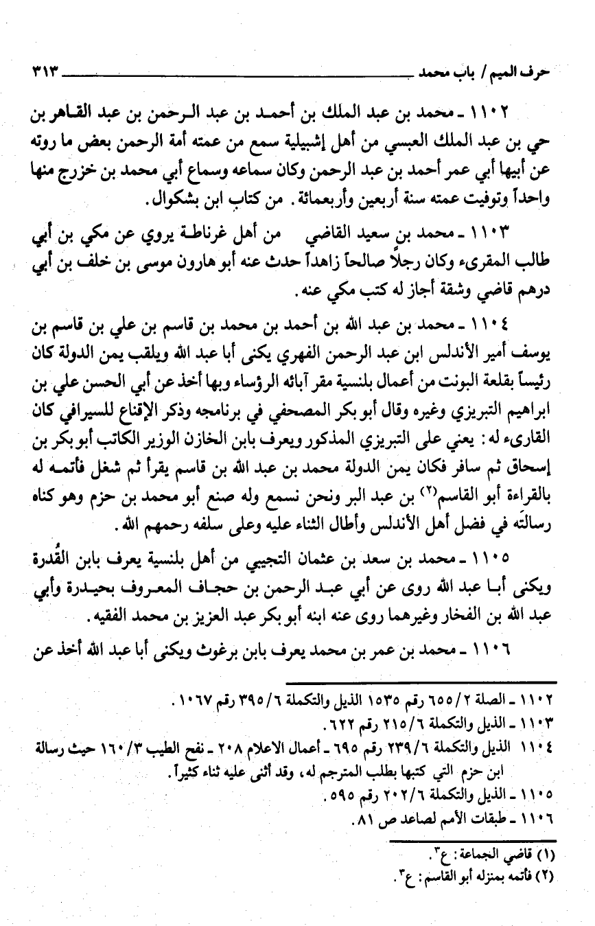 1102 - مُحَمَّد بْن عَبْد الْملك بن أَحْمَد بْن عَبْد الرَّحْمَن بْن عَبْد القاهر بْن حَيّ بْن عَبْد الْملك الْعَبْسِي من أَهْل إشبيلية سَمِعَ من عمته أمة الرَّحْمَن بَعْض مَا روته عَنْ أَبِيهَا أبي عُمَر أَحْمَد بْن عَبْد الرَّحْمَن وَكَانَ سَمَاعه وَسَمَاع أبي مُحَمَّد بْن خزرج مِنْهَا وَاحِدًا وَتوفيت عمته سنة أَرْبَعِينَ وَأَرْبَعمِائَة من كتاب ابْن بشكوال