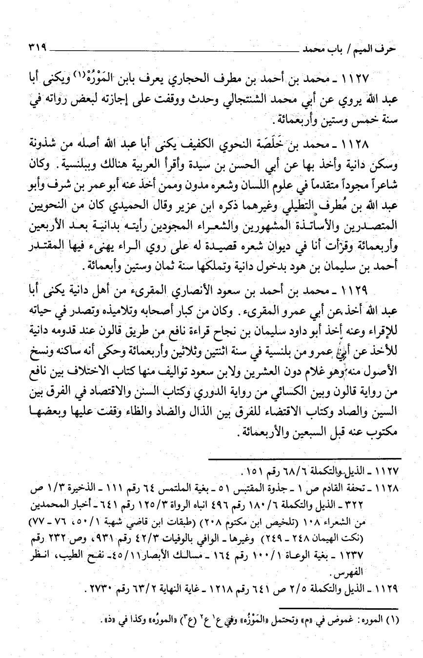 1129 - مُحَمّد بْن أَحْمَد بْن سعود الْأنْصَارِيّ المقرىء من أَهْلَ دانية يكنى أَبَا عَبْد اللَّه أَخذ عَنْ أبي عَمْرو المقرىء وَكَانَ من كبار أَصْحَابه وتلاميذه وتصدر فِي حَيَاته للإقراء وَعنهُ أَخذ أَبُو دَاوُد سُلَيْمَان بْن نجاح قِرَاءَة نَافِع من طَرِيق قالون عِنْدَ قدومه دانية للأخذ عَن أبي عَمْرو من بلنسِيَّة فِي سنة اثْنَتَيْنِ وَثَلَاثِينَ وَأَرْبَعمِائَة وَحكى أَنَّهُ ساكنه وَنسخ الْأُصُول مِنْهُ وَهُوَ غُلَام دون الْعشْرين وَلابْن سعود تواليف مِنْهَا كتاب الِاخْتِلَاف بَيْنَ نَافِع من رِوَايَة قالون وَبَين الْكسَائي من رِوَايَة الدوري وَكتاب السّنَن والاقتصاد فِي الْفرق بَيْنَ السِّين وَالصَّاد وَكتاب الِاقْتِضَاء للْفرق بَيْنَ الذَّال وَالضَّاد والظاء وقفت عَلَيْهَا وَبَعضهَا مَكْتُوب عَنْهُ قبل السّبْعين والأربعمائة