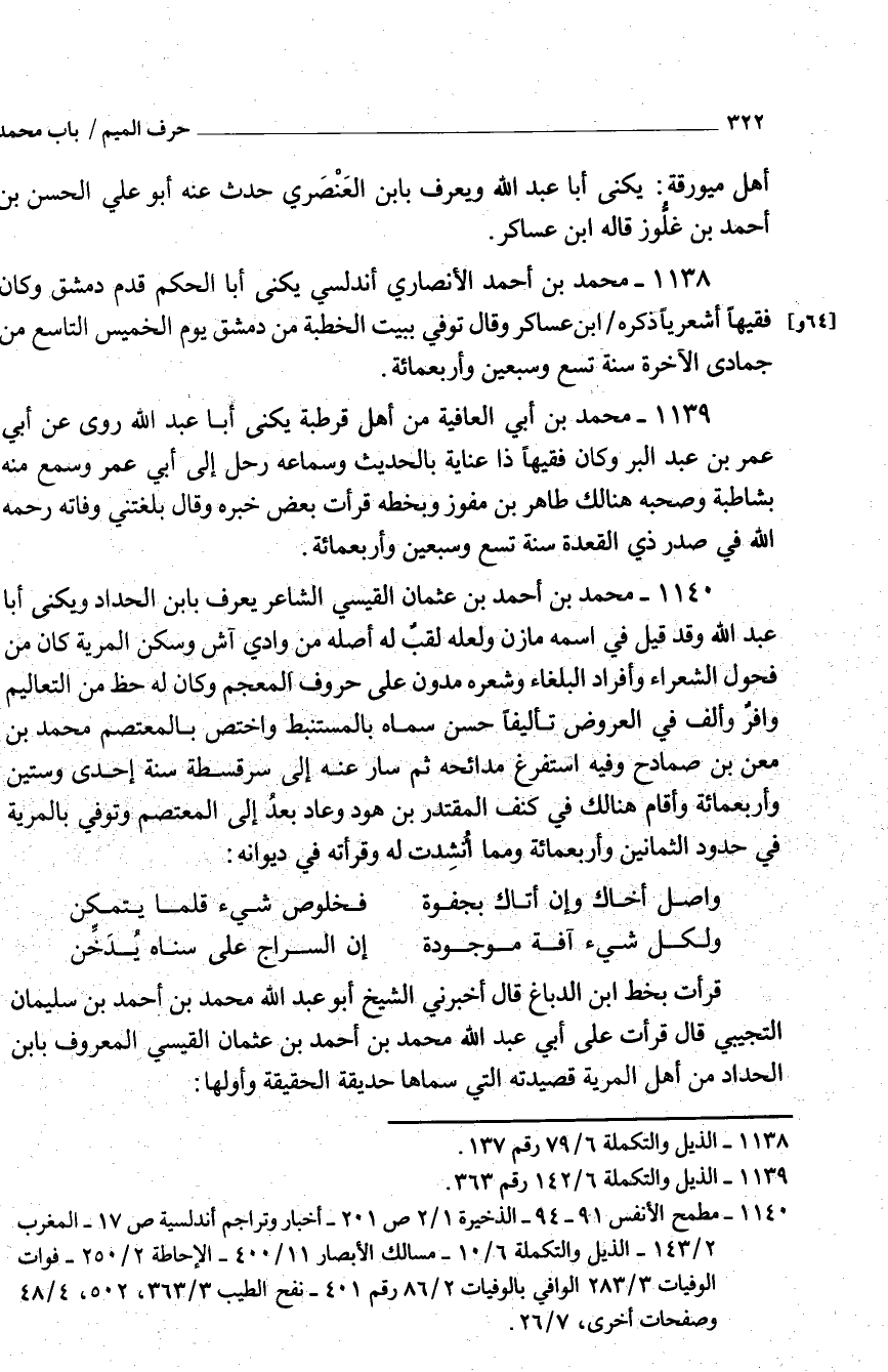1140 - مُحَمَّد بْن أَحْمَد بْن عُثْمَان القَيْسيّ الشَّاعِر يعرف بِابْن الْحداد ويكنى أَبَا عَبْد اللَّه وَقد قيل فِي اسْمه مَازِن وَلَعَلَّه لقبٌ لَهُ أَصله من وَادي آش وَسكن المرية كَانَ من فحول الشُّعَرَاء وأفراد البلغاء وشعره مدون عَلَى حُرُوف المعجم وَكَانَ لَهُ حَظّ من التعاليم وافرٌ وَألف فِي الْعرُوض تأليفًا حَسَن سَمَّاهُ بالمستنبط واختص بالمعتصم مُحَمَّد بْن معن بْن صمادح وَفِيه استفرغ مدائحه ثمَّ سَار عَنهُ إِلَى سرقسطة سنة إِحْدَى وَسِتِّينَ وَأَرْبَعمِائَة وَأقَام هُنَالك فِي كنف المقتدر بْن هود وَعَاد بعدُ إِلَى المعتصم وتُوُفيّ بالمرية فِي حُدُود الثَّمَانِينَ وَأَرْبَعمِائَة وَمِمَّا أُنشِدت لَهُ وقرأته فِي ديوانه