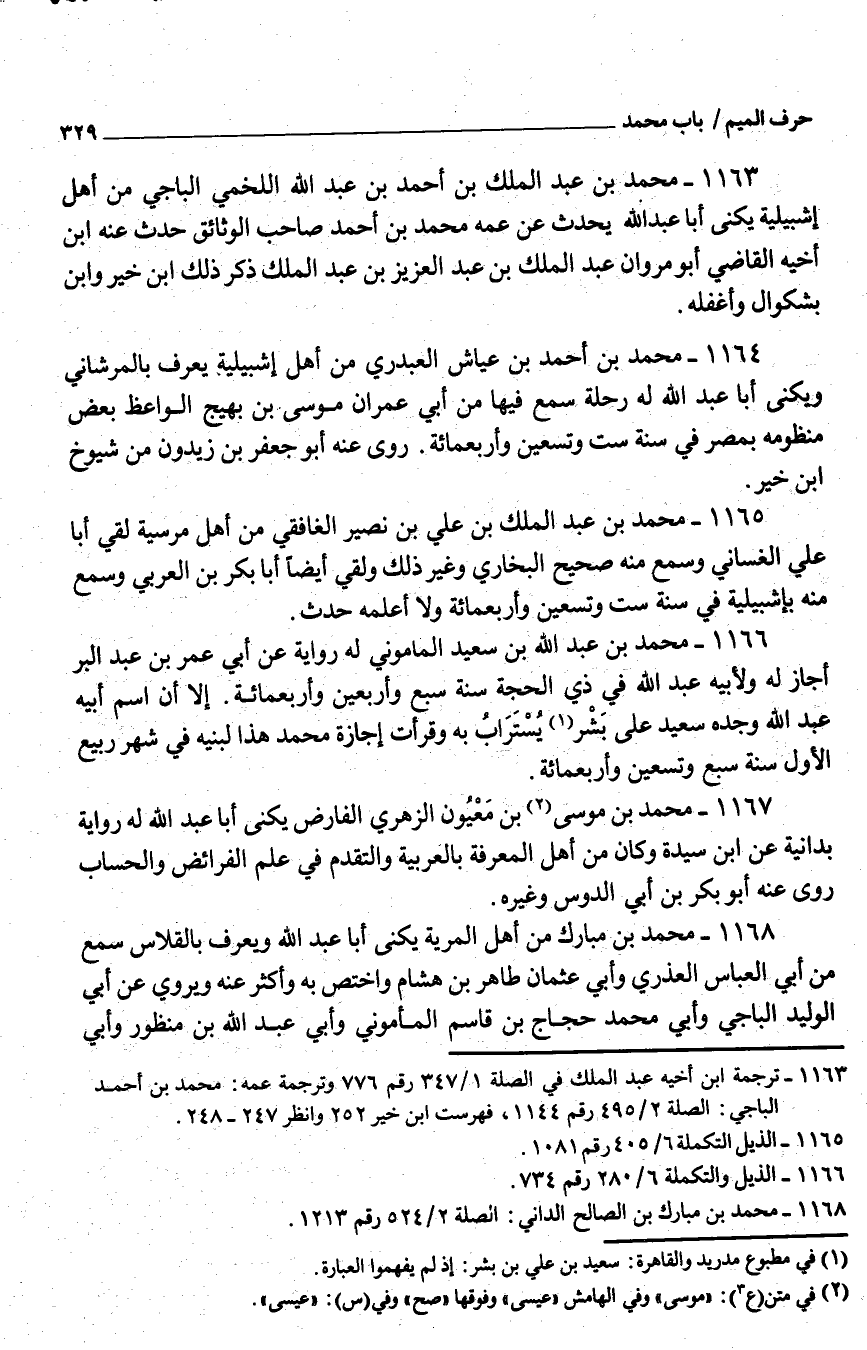 1163 - مُحَمَّد بْن عَبْد الْملك بْن أَحْمَد بْن عَبْد اللَّه اللَّخْميّ الْبَاجِيّ من أَهْلَ إشبيلية يكنى أَبَا عَبْد اللَّه يحدث عَنْ عَمه مُحَمَّد بْن أَحْمَد صَاحب الوثائق حدَّث عَنْهُ ابْن أَخِيه القَاضِي أَبُو مَرْوَان عَبْد الْملك بْن عبد الْعَزِيز بْن عَبْد الْملك ذَكَرَ ذَلِكَ ابْن خَير وَابْن بشكوال وأغفله
