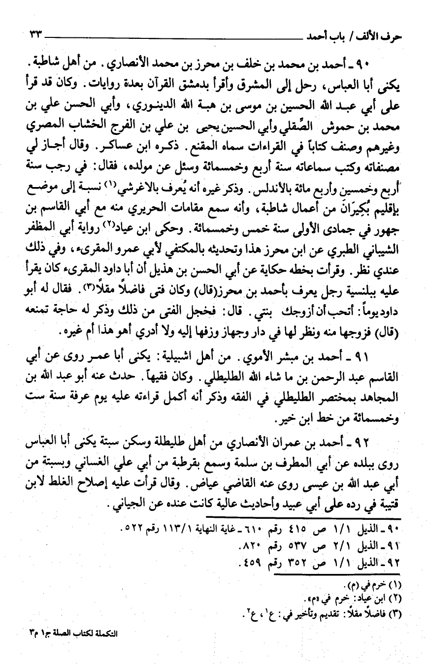 92 - أَحْمَد بْن عِمْرَانَ الْأَنْصَارِيّ من أَهْلَ طليطلة وَسكن سبتة يكنى أَبَا الْعَبَّاس روى بِبَلَدِهِ عَنْ أبي الْمطرف بْن سَلَمَة وَسمع بقرطبة من أبي عَلِيّ الغساني وبسبتة من أبي عَبْد اللَّه بْن عِيسَى روى عَنْهُ القَاضِي عِيَاض وَقَالَ قَرَأت عَلَيْهِ إصْلَاح الْغَلَط لِابْنِ قُتَيْبَةَ فِي رده عَلَى أبي عُبَيْد وَأَحَادِيث عالية كَانَتْ عِنْدَهُ عَنِ الجياني