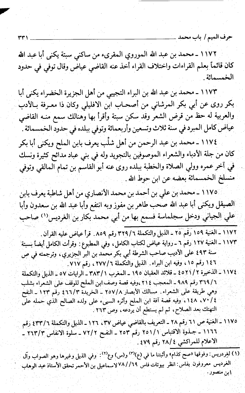 1172 - مُحَمَّد بْن عَبْد اللَّه الموروي المقرىء من سَاكِني سبتة يكنى أَبَا عَبْد اللَّه كَانَ قَائِما بِعلم الْقرَاءَات وَاخْتِلَاف الْقُرَّاء أَخذ عَنْهُ الْقُرَّاء أَخذ عَنْهُ القَاضِي عِيَاض وَقَالَ توفّي فِي حُدُود الْخَمْسمِائَةِ