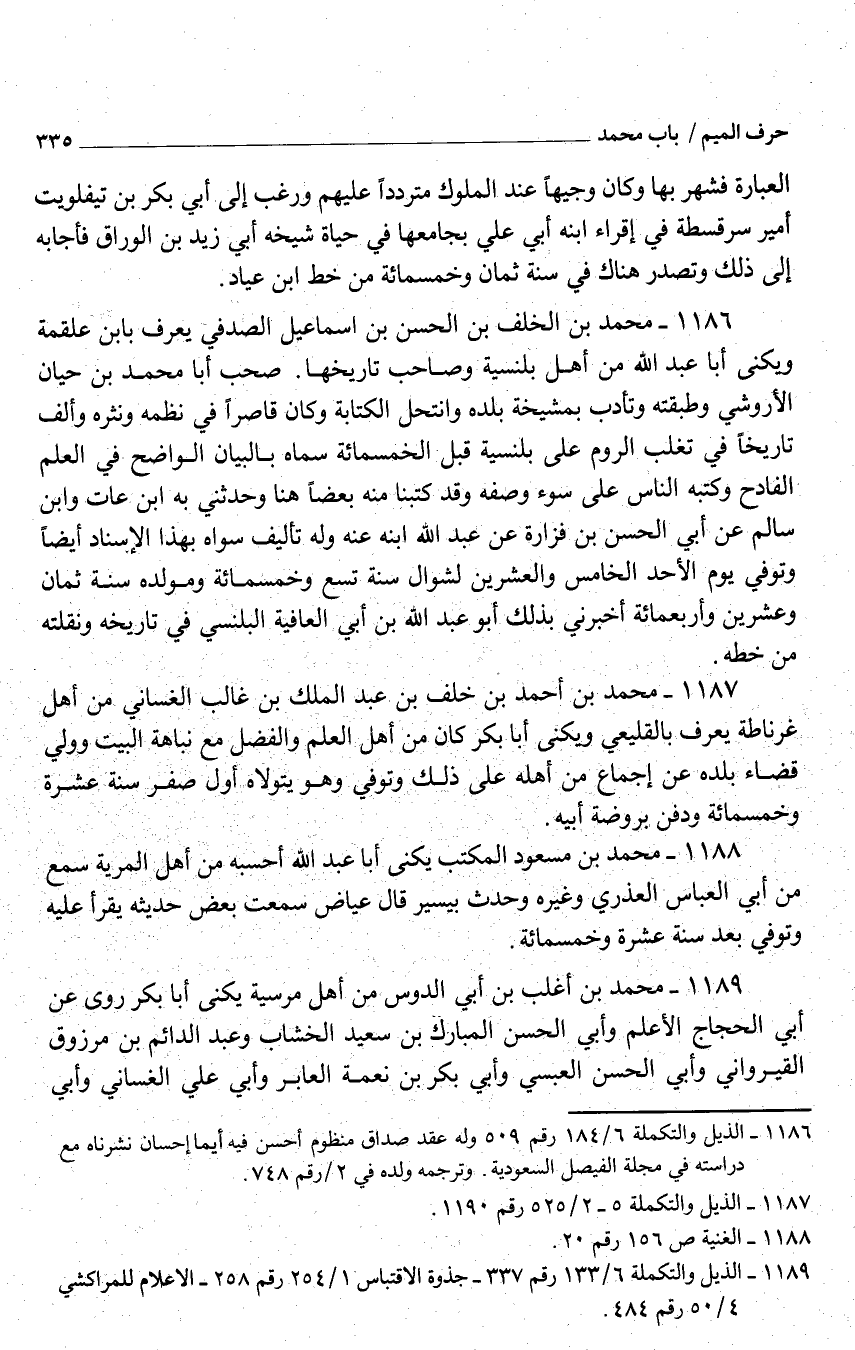 188 - مُحَمَّد بْن مَسْعُود الْمكتب يكنى أَبَا عَبْد اللَّه أَحْسبهُ من أَهْل المرية سَمِعَ من أبي الْعَبَّاس العذري وَغَيره وحدَّث بِيَسِير قَالَ عِيَاض سَمِعتُ بَعْض حَدِيثه يَقْرَأ عَلَيْهِ وَتُوفِّي بعد سنة عشرَة وَخَمْسمِائة