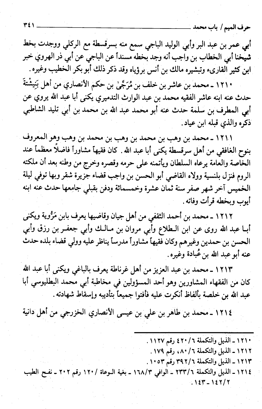 1210 - مُحَمَّد بْن عَاشر بْن خَلَف بْن مُرَجَّى بْن حكم الْأَنْصَارِيّ من أَهْل بَنِيشْتةَ حدَّث عَنْهُ ابْنه عَاشر الْفَقِيه مُحَمَّد بْن عَبْد الْوَارِث التدميري يكنى أَبَا عَبْد اللَّه يروي عَنْ أبي الْمطرف بْن سَلَمَة حدَّث عَنْهُ أَبُو مُحَمَّد عَبْد اللَّه بْن مُحَمَّد بْن أبي تليد الشاطبي ذكره وَالَّذِي قبله ابْن عياد