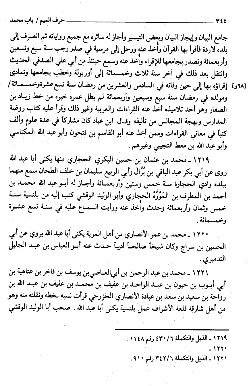 1219 - مُحَمَّد بْن عُثْمَان بْن حُسَيْن الْبكْرِيّ الحجاري مِنْهَا يكنى أَبَا عَبْد اللَّه روى عَنْ أبي بَكْر عَبْد الْبَاقِي بْن بُرَّال وَأبي الرّبيع سُلَيْمَان بن خلف الطَّحَّان سَمِعَ مِنْهُمَا بِبَلَدِهِ وَادي الْحِجَارَة سنة خمس وَسِتِّينَ وَأَرْبَعمِائَة وَأَجَازَ لَهُ أَبُو عَبْد اللَّه مُحَمَّد بن أَحْمد بن الْمطرف بن الموره الحجاري وَأَبُو الْوَلِيد الوقشي كتب إِلَيْهِ من بلنسية سنة خمس وثمان وَأَرْبَعمِائَة وحدَّث وأُخِذ عَنْهُ وَرَأَيْت السماع عَلَيْهِ فِي سنة تسع عشرَة وَخَمْسمِائة
