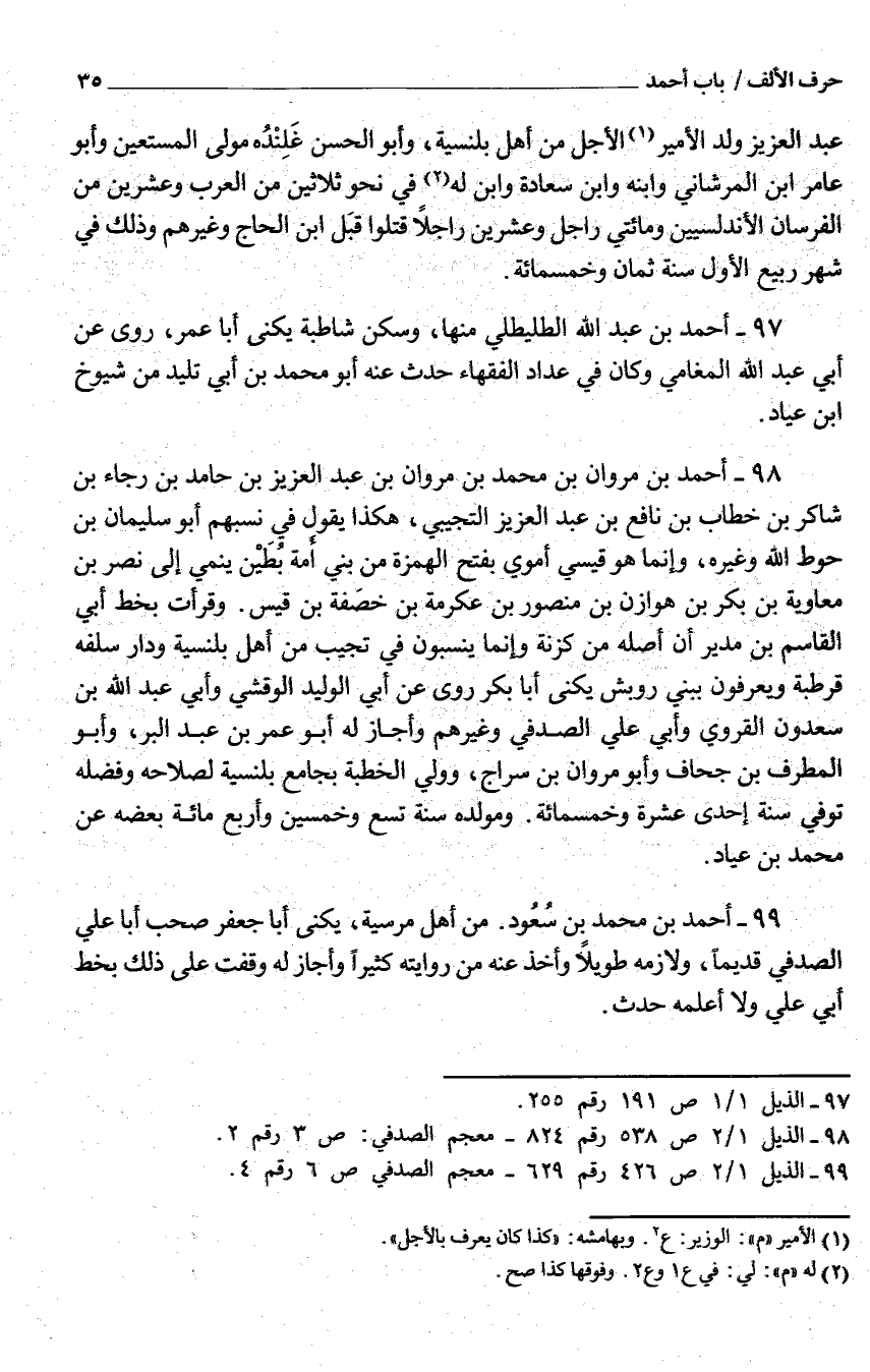 95 - أَحْمَد بْن يُوسُف التُّنوخيّ من أَهْلَ إشبيلية يكنى أَبَا الْعَبَّاس وَيعرف بِابْن الكماد يكان من أَهْلَ الْمعرفَة بِالْعدَدِ وصناعة النِّجامة مقدِّمًا فِيهَا عَلَى أَهْلَ عصره وَبني أزياجه وَمِنْهَا القبس والمستنبط عَلَى أرصاد أبي إِسْحَاق الطليطلي الْمَعْرُوف بالزورقالة وَاحِد أهل الأنندلس فِي ذَلِكَ أفادنيه بَعْض شُيُوخنَا وألزمنا إثْبَاته وَلم يذكر من روى عَنْهُ وَلَا وَفَاته