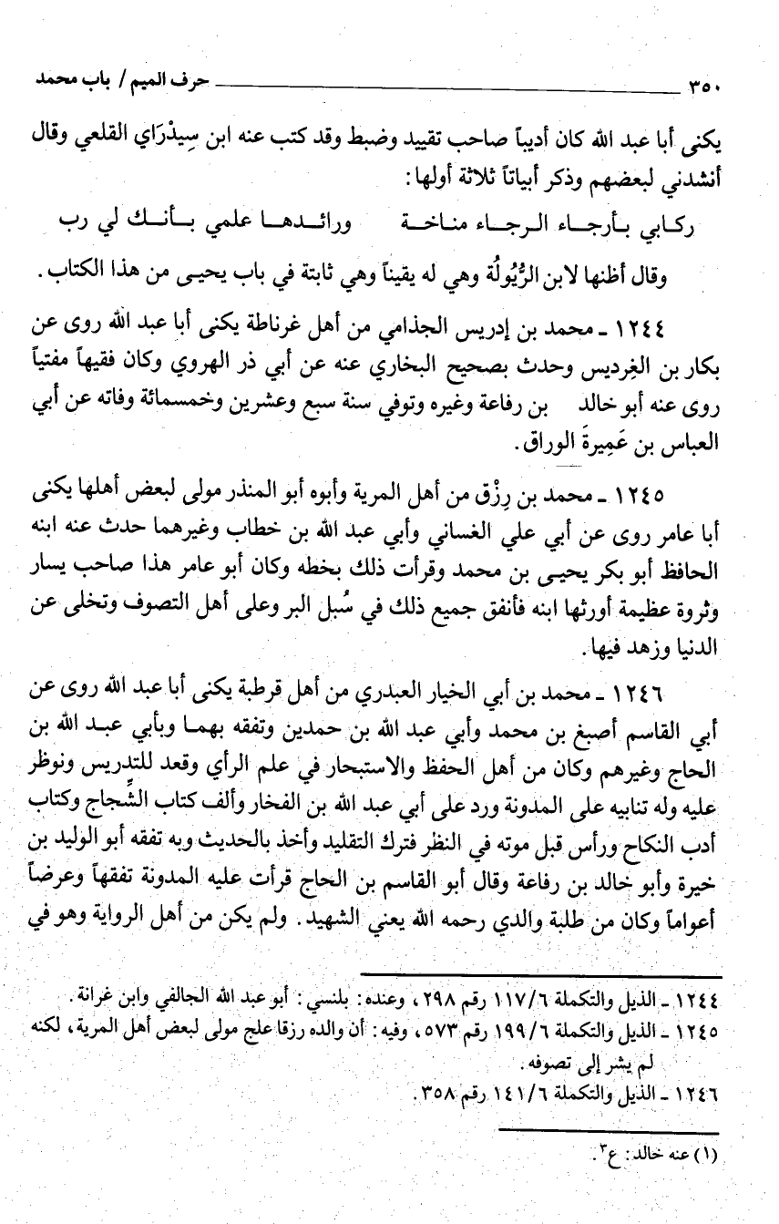 1244 - مُحَمَّد بْن إِدْرِيس الجذامي من أَهْلَ غرناطة يكنى أَبَا عَبْد اللَّه روى عَنْ بكار بْن الغِرديس وحدَّث بِصَحِيح الْبُخَارِيّ عَنْهُ عَنْ أبي ذَر الهَرَويّ وَكَانَ فَقِيها مفتيًا روى عَنْهُ أَبُو خَالِد بْن رِفَاعَة وَغَيره وتُوُفيّ سنة سبع وَعشْرين وَخَمْسمِائة وَفَاته عَنْ أبي الْعَبَّاس بْن عميرَة الْوراق