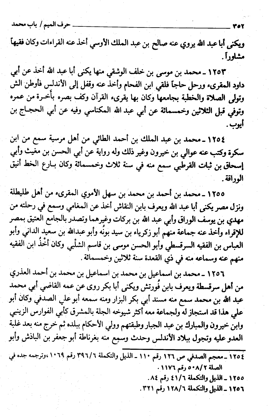 1253 - مُحَمَّد بن مُوسَى بْن خَلَف الوشقي مِنْهَا يكنى أَبَا عبد الله أَخذ عَنِ أبي دَاوُد المقرىء ورحل حَاجا فلقي ابْن الفحام وَأخذ عَنْهُ وقفل إِلَى الأندلس فأوطن الش وَتَوَلَّى الصَّلاة وَالْخطْبَة بجامعها وَكَانَ بهَا يقرىء الْقُرْآن وكف بَصَره بِأخرَة من عمره وَتُوفِّي قبل الثَّلَاثِينَ وَخَمْسمِائة عَنْ أبي عَبْد اللَّه المكناسي وَفِيه عَنْ أبي الحَجَّاج بْن أَيُّوب