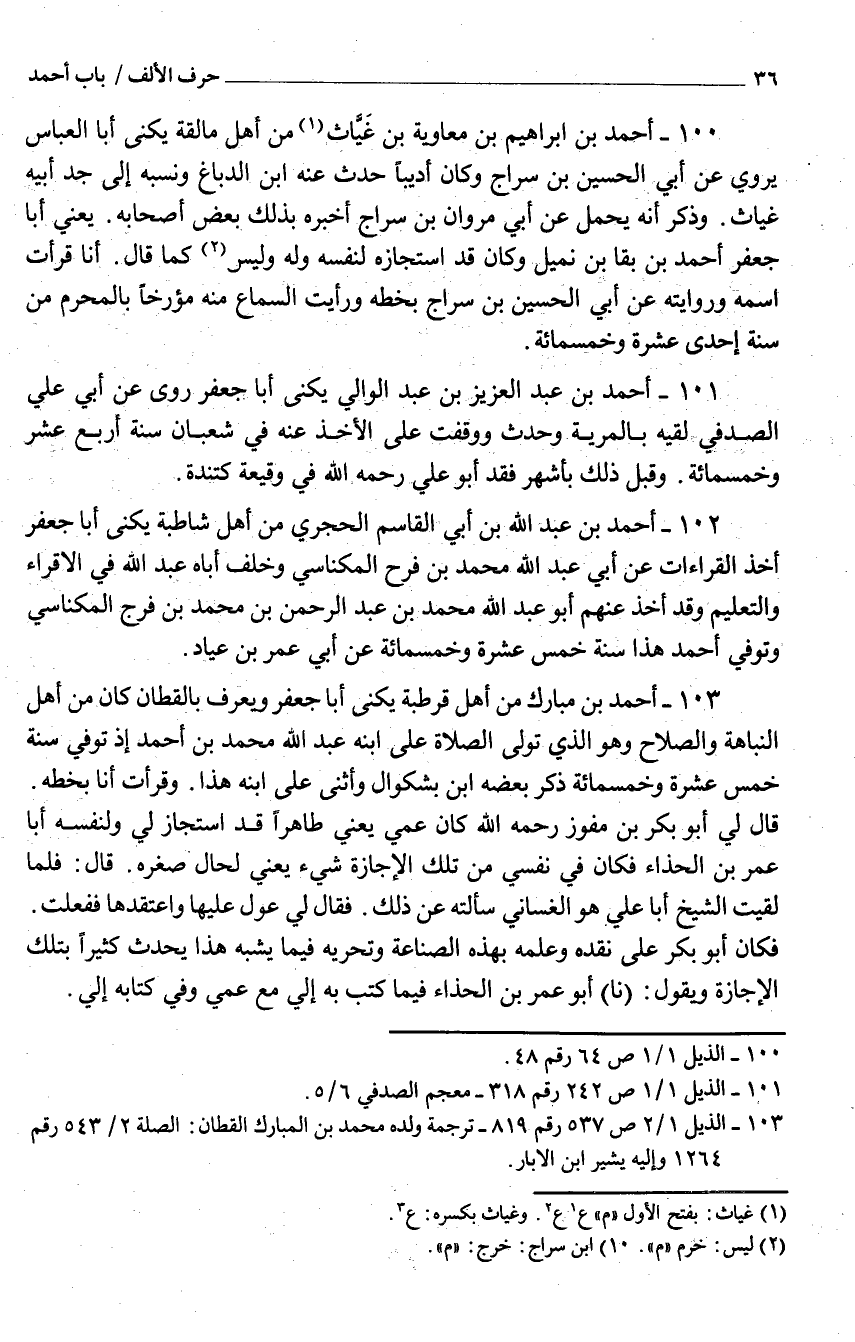100 - أَحْمَد بْن إِبْرَاهِيم بْن مُعَاوِيَة بْن غَيَّاث من أَهْلَ مالقة يكنى أَبَا الْعَبَّاس يروي عَنْ أبي الْحُسَيْن بْن سراج وَكَانَ أديبًا حدَّث عَنْهُ ابْن الدّباغ وَنسبه إِلَى جد أَبِيه غياث وَذَكَرَ أَنَّهُ يحمل عَنْ أبي مَرْوَان بْن سراج أخبرهُ بذلك بَعْض أَصْحَابه يَعْنِي أَبَا جَعْفَر أَحْمَد بْن بقا بْن نَمِيل وَكَانَ قَد استجازه لنَفسِهِ وَله وَلَيْسَ كَمَا قَالَ أَنَا قَرَأت اسْمه وَرِوَايَته عَنْ أبي الْحُسَيْن بْن سراج بِخَطِّهِ وَرَأَيْت السماع مِنْهُ مؤرخًا بالمحرم من سنة إِحْدَى عشرَة وَخَمْسمِائة