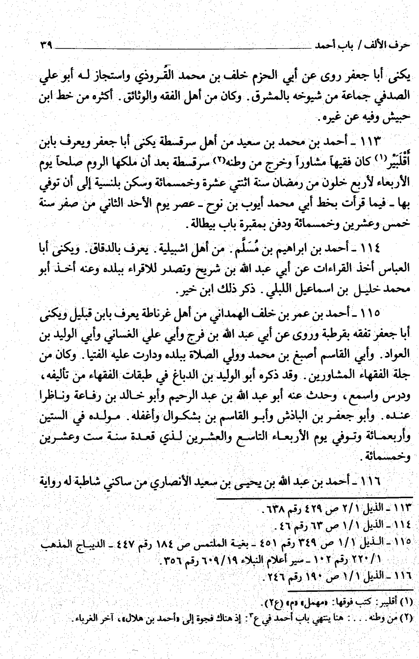 113 - أَحْمَد بْن مُحَمَّد بْن سَعِيد من أَهْلَ سرقسطة يكنى أَبَا جَعْفَر وَيعرف بِابْن أقْلَبَيْر كَانَ فَقِيها مشاورًا وَخرج من وَطنه سرقسطة بَعْدَ أنَّ ملكهَا الرّوم صلحا يَوْمَ الْأَرْبَعَاء لأَرْبَع خلون من رَمَضَان سنة اثْنَتَيْ عشرَة وَخَمْسمِائة وَسكن بلنسية إِلَى أنَّ تُوُفّي بهَا فِيمَا قَرَأت بِخَط أبي مُحَمَّد أيّوب بْن نوح عصر يَوْمَ الْأَحَد الثَّانِي من صَفَر سنة خمس وَعشْرين وَخَمْسمِائة ودُفِن بمقبرة بَاب بيطالة