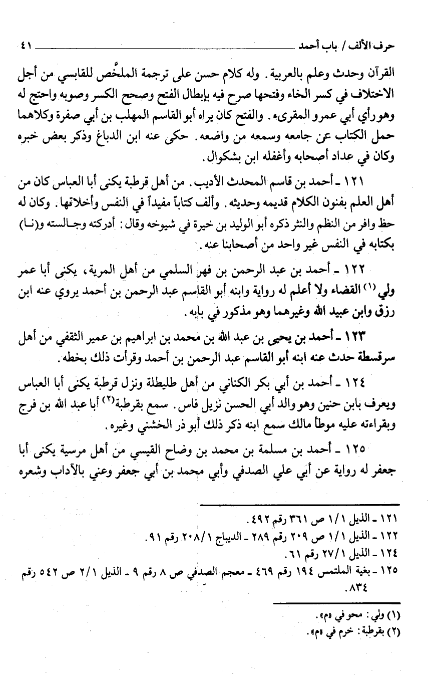 121 - أَحْمَد بْن قَاسم المحدّث الأديب من أَهْلَ قرطبة يكنى أَبَا الْعَبَّاس كَانَ من أَهْلَ الْعلم بفنون الْكَلَام قديمه وَحَدِيثه وَألف كتابا مُفِيدا فِي النَّفس وأخلاقها وَكَانَ لَهُ حَظّ وافر من النّظم والنثر ذكره أَبُو الْوَلِيد بْن خيرة فِي شُيُوخه وَقَالَ أَدْرَكته وجالسته ونا بكتابه فِي النَّفس غَيْر وَاحِد من أَصْحَابنَا عَنْهُ