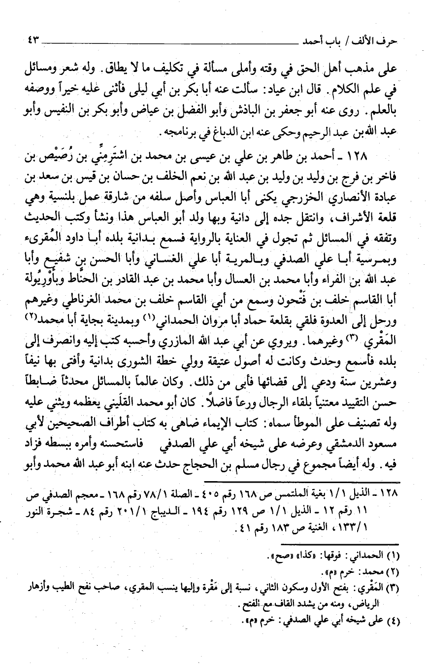 128 - أَحْمَد بْن طَاهِر بْن عَلِيّ بْن عِيسَى بْن مُحَمَّد بْن اشتَرِمِنِّي بْن رُصَيْص بْن فاخر بْن فرج بْن وليد بْن وليد بْن عَبْد اللَّه بْن نَعَم الْخلف بْن حسان بْن قيس بْن سَعْد بْن عبَادَة الْأَنْصَارِيّ الخزرجي يكنى أَبَا الْعَبَّاس وأصل سلفه من شارقة عمل بلنسية وَهِي قلعة الْأَشْرَاف وانتقل جَدّه إِلَى دانية وَبهَا وُلِدَ أَبُو الْعَبَّاس هَذَا وَنَشَأ وَكتب الحَدِيث وتَفَقَّه فِي الْمسَائِل ثُمَّ تجول فِي الْعِنَايَة بالرواية فَسمع بدانية بَلَده أبَا دَاوُد الْمُقْرِئ وبمرسية أَبَا عَلِيّ الصَّدَفِي وبالمرية أَبَا عَلِيّ الغساني وَأَبا الْحَسَن بْن شَفِيع وَأَبا عَبْد اللَّه بْن الْفراء وَأَبا مُحَمَّد بْن الْعَسَّال وَأَبا مُحَمَّد بْن عَبْد الْقَادِر بْن الحنَّاط وبأوْرِيُولة أَبَا القَاسِم خَلَف بْن فَتْحون وَسمع من أبي القَاسِم خَلَف بْن مُحَمَّد الغرناطي وَغَيرهم ورحل إِلَى العدوة فلقي بقلعة حَمَّاد أَبَا مَرْوَان الحمداني وبمدينة بجاية أَبَا مُحَمَّد المَقْري وَغَيرهمَا ويروي عَنْ أبي عَبْد اللَّه الْمَازرِيّ وَأَحْسبهُ كتب إِلَيْهِ وَانْصَرف إِلَى بَلَده فَأَسْمع وحدَّث وَكَانَت لَهُ أصُول عتيقة وَولي خطة الشورى بدانية وَأفْتى بهَا نيفًا وَعشْرين سنة ودعي إِلَى قَضَائهَا فَأبى من ذَلِكَ وَكَانَ عَالما بالمسائل مُحدثا ضابطًا حَسَن التَّقْيِيد معتنيا بلقاء الرِّجَال ورعًا فَاضلا كَانَ أَبُو مُحَمَّد القلَيني يعظمه ويثني عَلَيْهِ وَله تصنيف عَلَى الْمُوَطَّأ سَمَّاهُ كتاب الْإِيمَاء ضاهي بِهِ كتاب أَطْرَاف الصَّحِيحَيْنِ لأبي مَسْعُود الدّمشقيّ وَعرضه عَلَى شَيْخه أبي عَلِيّ الصَّدَفِي فَاسْتَحْسَنَهُ وَأمره ببسطه فَزَاد فِيهِ وَله أَيْضا مَجْمُوع فِي رجال مُسْلِم بْن الحَجَّاج حَدَّث عَنْهُ ابْنه أَبُو عَبْد اللَّه مُحَمَّد وَأَبُو