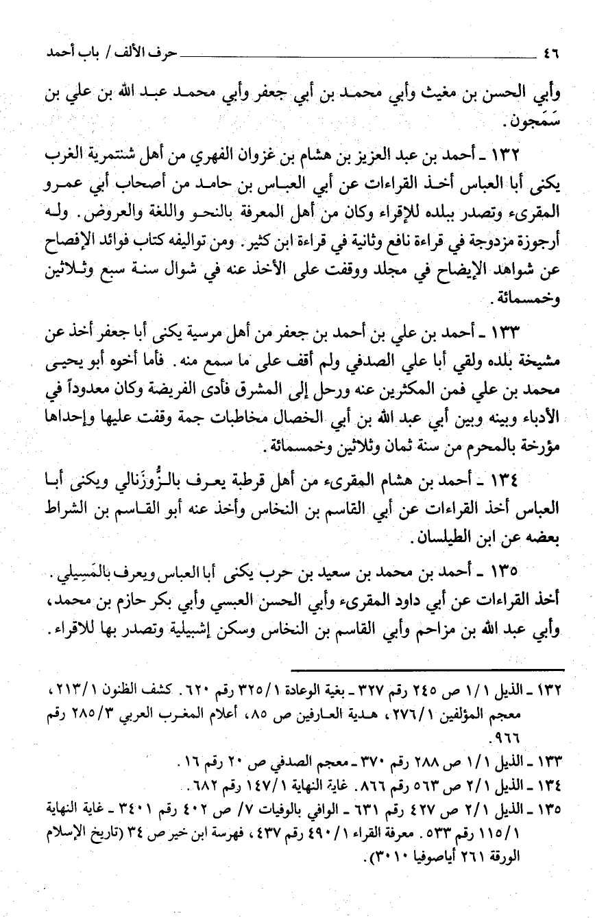 134 - أَحْمَد بْن هِشَام الْمُقْرِئ من أَهْلَ قرطبة يعرف بالزُّوزَنالي ويكنى أَبَا الْعَبَّاس أَخذ الْقرَاءَات عَنْ أبي القَاسِم بْن النخاس وَأخذ عَنْهُ أَبُو القَاسِم بْن الشراط بعضه عَنِ ابْن الطيلسان