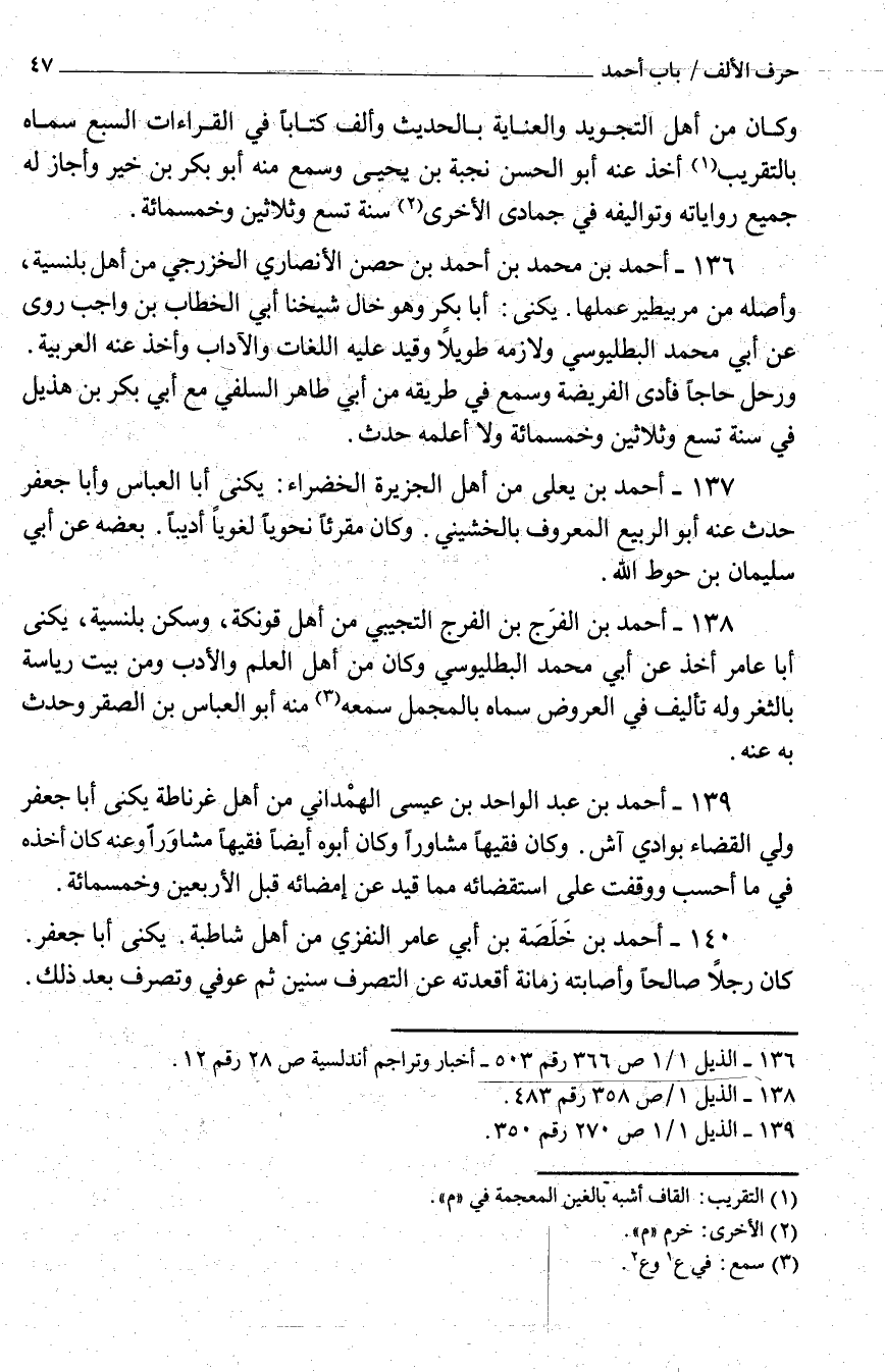 136 - أَحْمَد بْن مُحَمَّد بْن أَحْمَد بْن حصن الْأَنْصَارِيّ الخزرجي من أَهْلَ بلنسية وَأَصله من مربيطير عَملهَا يكنى أَبَا بَكْر وَهُوَ خَال شَيخنَا أبي الخَطَّاب بْن وَاجِب روى عَنْ أبي مُحَمَّد البطليوسي ولازمه طَويلا وَقيد عَلَيْهِ اللُّغَات والآداب وَأخذ عَنْهُ الْعَرَبيَّة ورحل حَاجا فَأدى الْفَرِيضَة وَسمع فِي طَرِيقه من أبي طَاهِر السِّلَفيّ مَعَ أبي بَكْر بْن هُذَيْل فِي سنة تسع وَثَلَاثِينَ وَخَمْسمِائة وَلَا أعلمهُ حدَّث