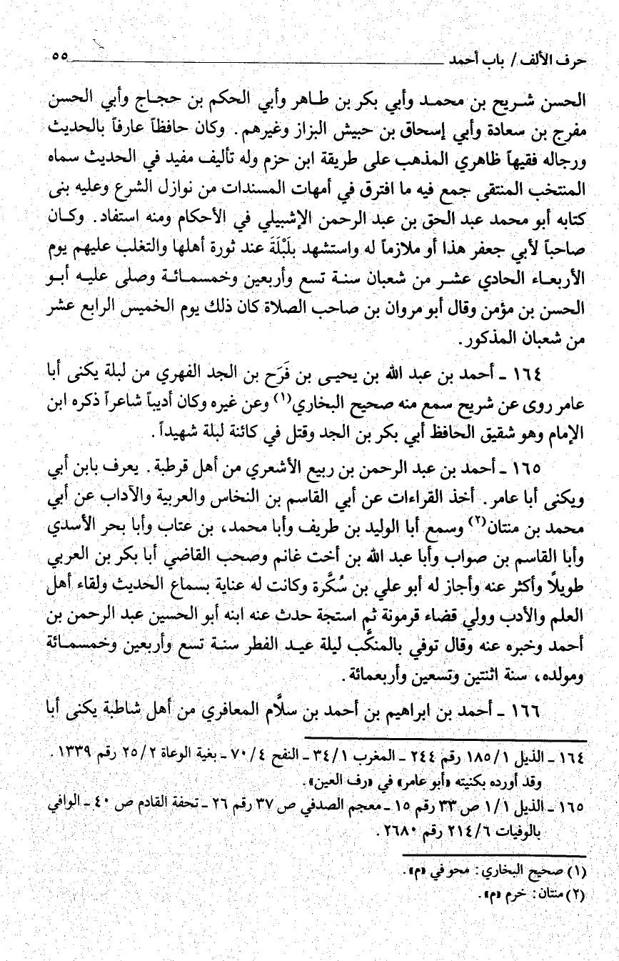 164 - أَحْمَد بْن عَبْد اللَّه بْن يحيى بْن فَرَح بْن الْجد الفِهري من لبلة يكنى أَبَا عَامر روى عَنْ شُرَيْح سَمِعَ مِنْهُ صَحِيح الْبُخَارِيّ وَعَن غَيره وَكَانَ أديبًا شَاعِرًا ذكره ابْن الْإِمَام وَهُوَ شَقِيق الْحَافِظ أبي بَكْر بْن الْجد وَقتل فِي كائنة لبلة شَهِيدا