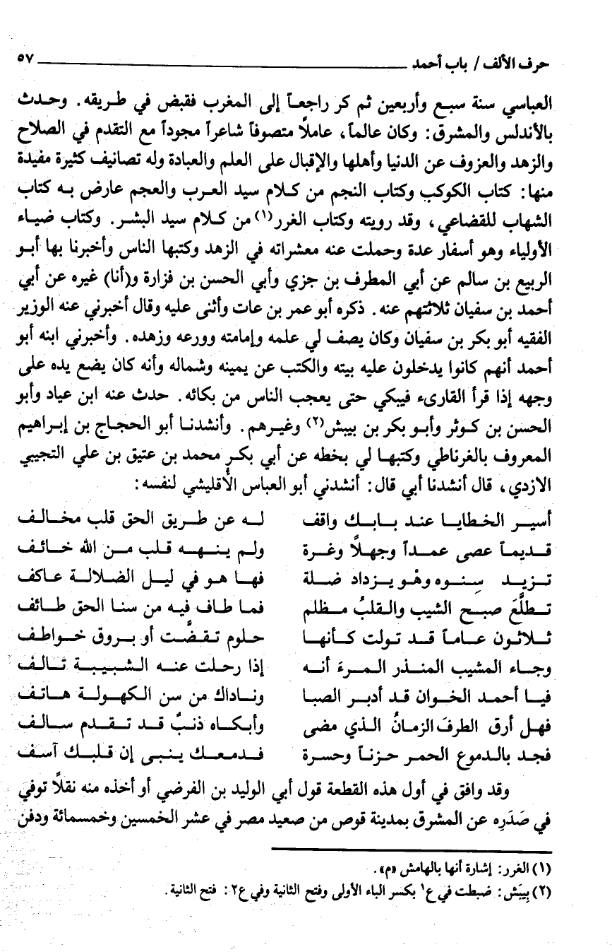 العباسي سنة سبْعٍ وَأَرْبَعين ثُمَّ كرّ رَاجعا إِلَى الْمغرب فَقبض فِي طَرِيقه وحدَّث بالأندلس والمشرق وَكَانَ عَالما عَاملا متصوفًا شَاعِرًا مجودًا مَعَ التَّقَدُّم فِي الصّلاح والزهد والعزوف عَنِ الدُّنْيَا وَأَهْلهَا والإقبال عَلَى الْعلم وَالْعِبَادَة وَله تصانيف كَثِيرَة مفيدة مِنْهَا كتاب الْكَوْكَب وَكتاب النَّجْم من كَلَام سيد الْعَرَب والعجم عَارض بِهِ كتاب الشهَاب للقضاعي وَقد رويته وَكتاب الْغرَر من كَلَام سيد الْبشر وَكتاب ضِيَاء الْأَوْلِيَاء وَهُوَ أسفار عدَّة وحملت عَنْهُ معشراته فِي الزّهْد وكتبها النَّاس وَأخْبرنَا بهَا أَبُو الرّبيع بْن سَالم عَنْ أبي الْمطرف بْن جزي وَأبي الْحَسَن بْن فَزَارَة وَأَنا غَيره عَنْ أبي أَحْمَد بن سُفْيَان ثَلَاثَتهمْ عَنهُ ذكره أَبُو عمر بن عَاتٍ وَأثْنى عَلَيْهِ وَقَالَ أَخْبرنِي عَنْهُ الْوَزير الْفَقِيه أَبُو بَكْر بْن سُفْيَان وَكَانَ يصف لي علمه وإمامته وورعه وزهده وَأَخْبرنِي ابْنه أَبُو أَحْمَد أَنهم كَانُوا يدْخلُونَ عَلَيْهِ بَيته والكتب عَنْ يَمِينه وشماله وَأَنه كَانَ يضع يَده على وَجهه إِذا قَرَأَ القارىء فيبكي حَتَّى يعجب النَّاس من بكائه حدث عَنهُ ابْن عياد وَأَبُو الْحَسَن بْن كوثر وَأَبُو بَكْر بن بيبش وَغَيرهم وأنشدنا أَبُو الحَجَّاج بْن إِبْرَاهِيم الْمَعْرُوف بالغرناطي وكتبها لي بِخَطِّهِ عَنْ أبي بَكْر مُحَمَّد بْن عَتيق بْن عَلِيّ التجِيبِي الْأَزْدِيّ قَالَ أنشدنا أبي قَالَ أَنْشدني أَبُو الْعَبَّاس الأُقليشي لنَفسِهِ