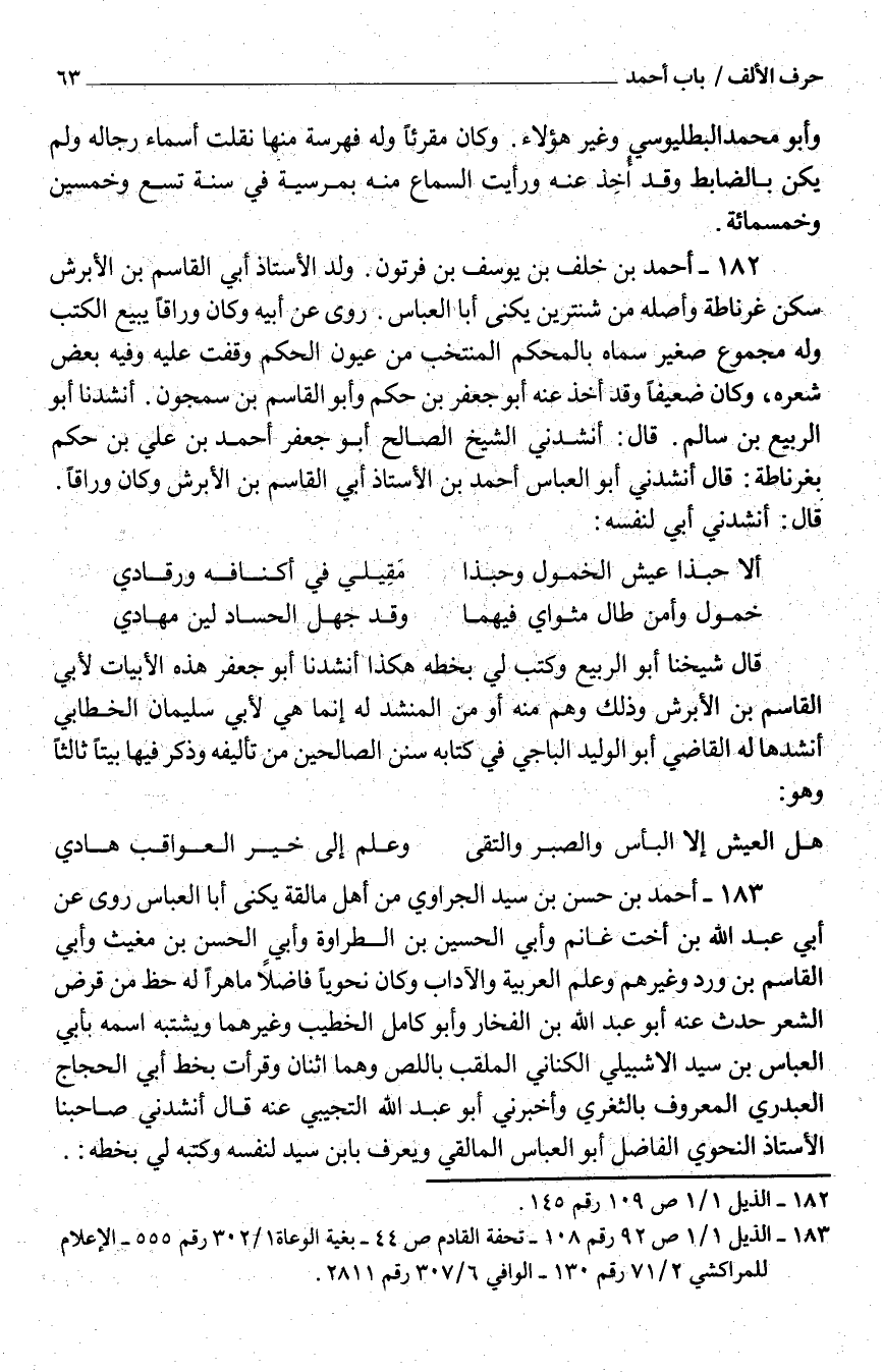 183 - أَحْمَد بْن حَسَن بْن سيد الجراوي من أَهْلَ مالقة يكنى أَبَا الْعَبَّاس روى عَنْ أبي عَبْد اللَّه بْن أُخْت غَانِم وَأبي الْحُسَيْن بن الطراوة وَأبي الْحَسَن بْن مغيث وَأبي الْقَاسِم بن ورد وَغَيرهم وَعلم الْعَرَبيَّة والآداب وَكَانَ نحويا فَاضلا ماهرا لَهُ حَظّ من قرض الشّعْر حدَّث عَنْهُ أَبُو عَبْد اللَّه بْن الفخار وَأَبُو كَامِل الْخَطِيب وَغَيرهمَا وَيشْتَبه اسْمه بِأبي الْعَبَّاس بن سيد الاشبيلي الكتاني الملقب باللص وهما اثْنَان وقرأت بِخَط أبي الحَجَّاج الْعَبدَرِي الْمَعْرُوف بالثغري وَأَخْبرنِي أَبُو عَبْد اللَّه التجِيبِي عَنْهُ قَالَ أَنْشدني صاحبنا الْأُسْتَاذ النَّحْوِيّ الْفَاضِل أَبُو الْعَبَّاس المالقي وَيعرف بِابْن سيد لنَفسِهِ وَكتبه لي بِخَطِّهِ