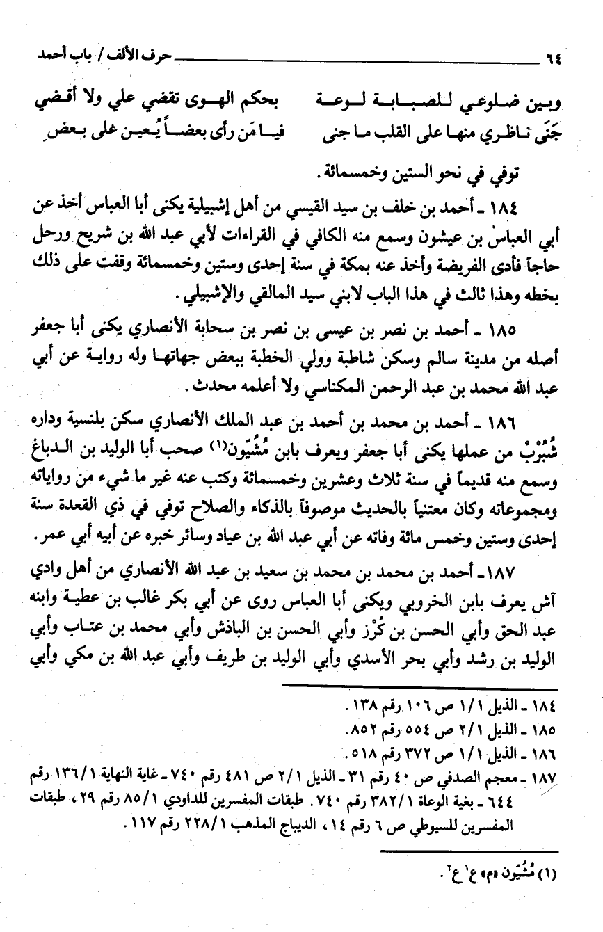 184 - أَحْمَد بْن خَلَف بْن سيد القَيْسيّ من أَهْلَ إشبيلية يكنى أَبَا الْعَبَّاس أَخذ عَنْ أبي الْعَبَّاس بْن عيشون وَسمع مِنْهُ الْكَافِي فِي الْقرَاءَات لأبي عَبْد اللَّه بْن شُرَيْح ورحل حَاجا فَأدى الْفَرِيضَة وَأخذ عَنْهُ بِمَكَّة فِي سنة إِحْدَى وَسِتِّينَ وَخَمْسمِائة وقفت على نَحْو ذَلِكَ بِخَطِّهِ وَهَذَا ثَالِث فِي هَذَا الْبَاب لَا بني سيد المالقي والإشبيلي