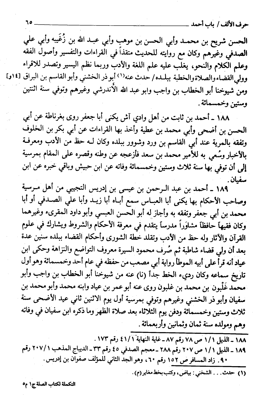 188 - أَحْمَد بْن ثَابت من أَهْلَ وَادي آش يكنى أَبَا جَعْفَر روى بغرناطة عَنْ أبي الْحَسَن بْن أضحى وَأبي مُحَمَّد بْن عَطِيَّة وَأخذ بهَا الْقرَاءَات عَنْ أبي بَكْر بْن الخلوف وتَفَقَّه بالمرية عِنْدَ أبي القَاسِم بْن ورد وشوور بِبَلَدِهِ وَكَانَ لَهُ حَظّ من الْأَدَب وَمَعْرِفَة بالأخبار وسُعي بِهِ للأمير مُحَمَّد بْن سَعْد فأزعجه عَنْ وَطنه وقصره عَلَى الْمقَام بمرسية إِلَى أنَّ تُوُفّي بهَا سنة ثَلَاث وستِّين وَخَمْسمِائة وَفَاته عَنِ ابْن حُبَيْش وَبَاقِي خَبره عَنِ ابْن سُفْيَان 1893 أَحْمَد بْن عَبْد الرَّحْمَن بْن عِيسَى بْن إِدْرِيس التجِيبِي من أَهْلَ مرسية وَصَاحب الْأَحْكَام بهَا يكنى أَبَا الْعَبَّاس سَمِعَ أَبَاهُ أَبَا زَيْدُ وَأَبا عَلِيّ الصَّدَفِي أَوْ أبَا مُحَمَّد بْن أبي جَعْفَر وتَفَقَّه بِهِ وَأَجَازَ لَهُ أَبُو الْحسن الْعَبْسِي وَأَبُو دَاوُد المقرىء وَغَيرهمَا وَكَانَ فَقِيها حَافِظًا مشاوَرًا مدرسًا يتَقَدَّم فِي معرفَة الْأَحْكَام والشروط ويشارك فِي عُلُوم الْقُرْآن والْآثَار وَله حَظّ من الْأَدَب وتقلد خطة الشورى وَأَحْكَام الْقَضَاء بِبَلَدِهِ سِنين عدَّة بَعْدَ أنَّ وُلّي قَضَاء شاطبة ثُمَّ صُرف مَحْمُود السّيرة مَعْرُوف التَّوَاضُع والنزاهة وَحكى ابْن عياد أَنَّهُ قَرَأَ عَلَى أَبِيهِ الْمُوَطَّأ رِوَايَة أبي مُصْعَب من حفظه فِي عَامَ أحد وَخَمْسمِائة وَهُوَ أول تَارِيخ سَمَاعه وَكَانَ رَدِيء الْخط جدا نَا عَنْهُ من شُيُوخنَا أَبُو الْخطاب بْن وَاجِب وَأَبُو مُحَمَّد غَلْبون بْن مُحَمَّد بْن غلبون روى عَنْهُ أَبُو عُمَر بْن عياد وَابْنه مُحَمَّد وَأَبُو مُحَمَّد بْن سُفْيَان وَأَبُو ذَر الْخُشَنِي وَغَيرهم وتُوُفيّ بمرسية أَوْل يَوْمَ الِاثْنَيْنِ ثَانِي عيد الْأَضْحَى سنة ثَلَاث وستِّين وَخَمْسمِائة ودُفِن يَوْمَ الثُّلَاثَاء بَعْدَ صَلاَة الظّهْر وَمَا ذكره ابْن سُفْيَان فِي وَفَاته وهم ومولده سنة ثَمَان وَثَمَانِينَ وَأَرْبَعمِائَة
