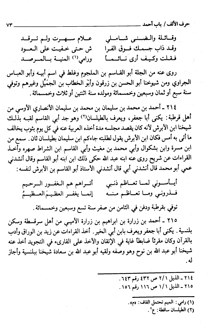 214 - أَحْمَد بْن مُحَمَّد بْن سُلَيْمَان بْن مُحَمَّد بْن سُلَيْمَان الْأَنْصَارِيّ الأوسي من أَهْلَ قرطبة يكنى أَبَا جَعْفَر وَيعرف بالطيلسان وَهُوَ جد أبي القَاسِم لقبه بذلك شَيخنَا ابْن الأبرش لأنَّه كَانَ يقْصد مَجْلِسه مدّة أَخذه الْعَرَبيَّة عَنْهُ فِي كلّ يَوْم بِثَوْب يُخَالف مَا أَتَى بِهِ أمس فَكَانَ ابْن الأبرش يَقُولُ لطلبته جَاءَكُم ابْن سُلَيْمَان بطيلسان ثَان سَمِعَ من ابْن مَسَرَّة وَابْن بشكوال وَأبي مُحَمَّد بْن مغيث وَأبي القَاسِم ابْن الشراط صهره وَأخذ الْقرَاءَات عَنْ شُرَيْح روى عه ابْنه عَبْد اللَّه حكى ذَلِكَ ابْن ابْنه أَبُو القَاسِم وَقَالَ أَنْشدني عمي أَبُو مُحَمَّد قَالَ أَنْشدني أبي قَالَ أَنْشدني الْأُسْتَاذ أَبُو القَاسِم بْن الأبرش لنَفسِهِ