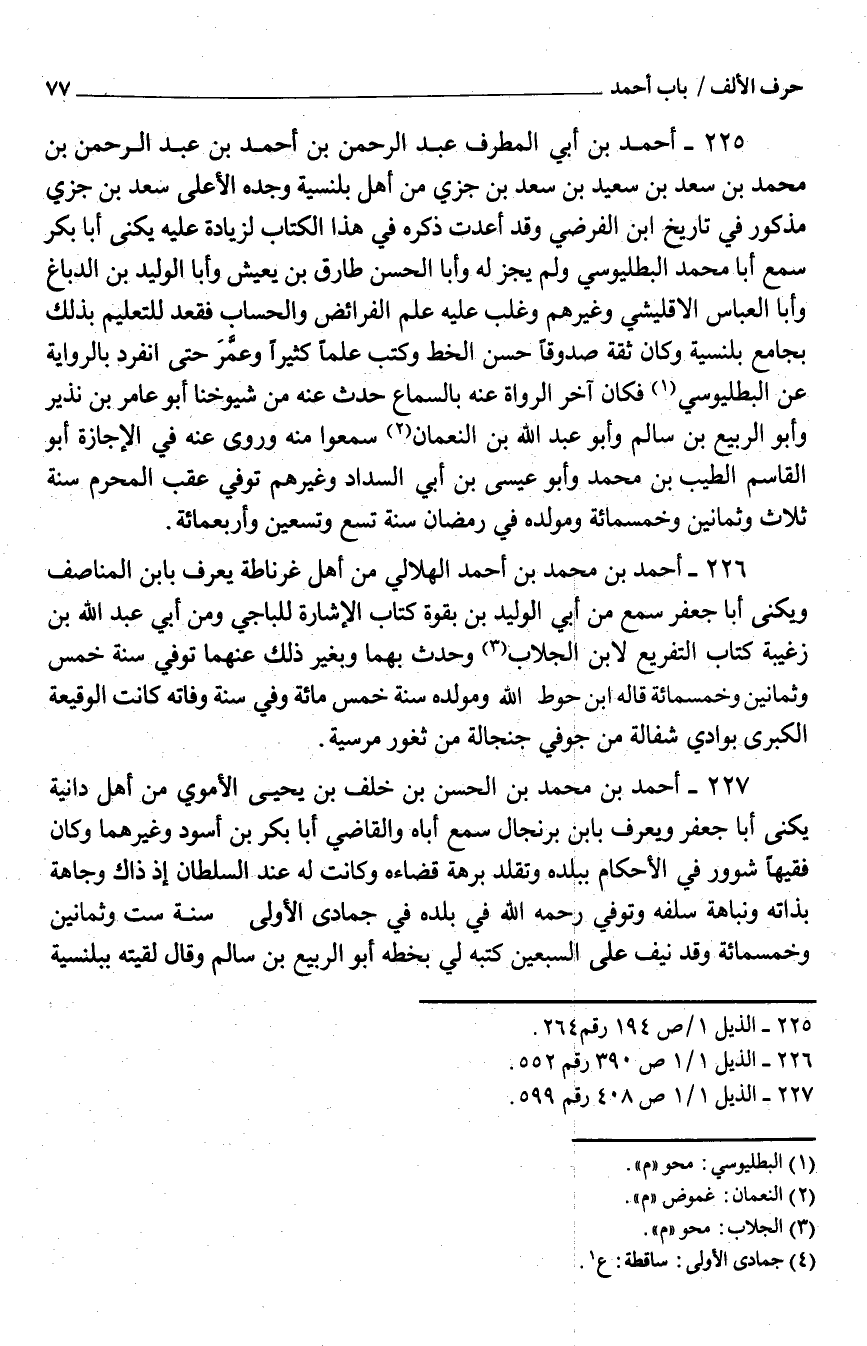 225 - أَحْمَد بْن أبي الْمطرف عَبْد الرَّحْمَن بْن أَحْمَد بْن عَبْد الرَّحْمَن بْن مُحَمَّد بْن سَعْد بْن سَعِيد بْن سَعْد بْن جزي من أَهْلَ بلنسية وجده الْأَعْلَى سَعْد بْن جزي مَذْكُور فِي تَارِيخ ابْن الفَرَضيّ وَقد أعدت ذكره فِي هَذَا الْكتاب لزِيَادَة عَلَيْهِ يكنى أَبَا بَكْر سَمِعَ أَبَا مُحَمَّد البطليوسي وَلم يجز لَهُ وَأَبا الْحَسَن طَارق بْن يعِيش وَأَبا الْوَلِيد بْن الدّباغ وَأَبا الْعَبَّاس الإقليشي وَغَيرهم وَغلب عَلَيْهِ عَلَمُ الْفَرَائِض والحساب فَقعدَ للتعليم بذلك بِجَامِع بلنسية وَكَانَ ثِقَة صَدُوقًا حَسَن الْخط وَكتب علما كثيرا وعمَّرَ حَتَّى انْفَرد بالرواية عَنِ البطليوسي فَكَانَ آخر الروَاة عَنْهُ بِالسَّمَاعِ حدَّث عَنْهُ من شُيُوخنَا أَبُو عَامر بْن نَذِير وَأَبُو الرّبيع بْن سَالم وَأَبُو عَبْد اللَّه بْن النُّعْمَان سمعُوا مِنْهُ وروى عَنْهُ فِي الْإِجَازَة أَبُو القَاسِم الطّيب بْن مُحَمَّد وَأَبُو عِيسَى بْن أبي السداد وَغَيرهم تُوُفّي عقب المُحَرَّم سنة ثَلَاث وَثَمَانِينَ وَخَمْسمِائة ومولده فِي رَمَضَان سنة تسع وَتِسْعين وَأَرْبَعمِائَة