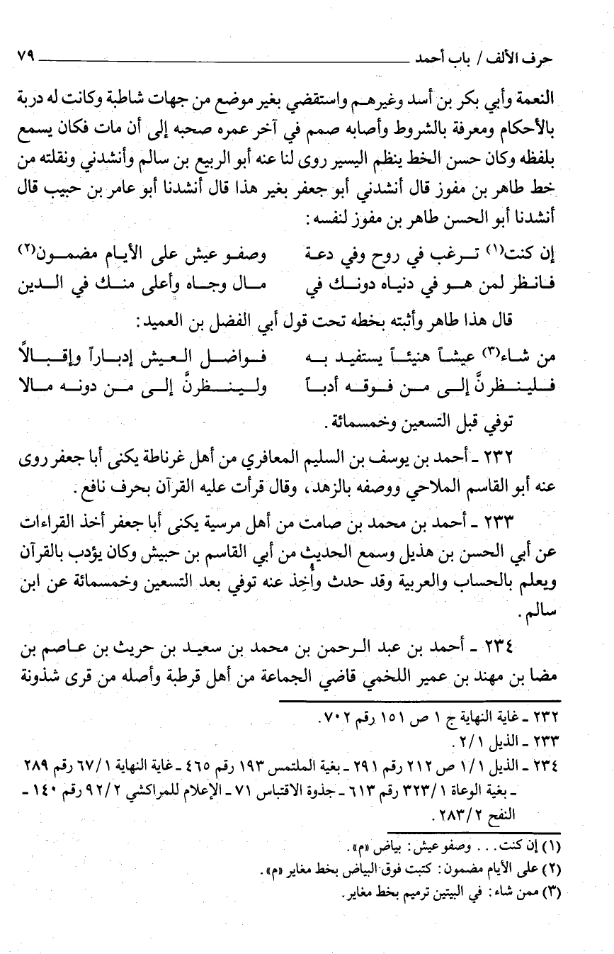 232 - أَحْمَد بْن يُوسُف بْن السَّلِيم الْمعَافِرِي من أَهْلَ غرناطة يكنى أَبَا جَعْفَر روى عَنْهُ أَبُو القَاسِم الملاحي وَوَصفه بالزهد وَقَالَ قَرَأت عَلَيْهِ الْقُرْآن بِحرف نَافِع