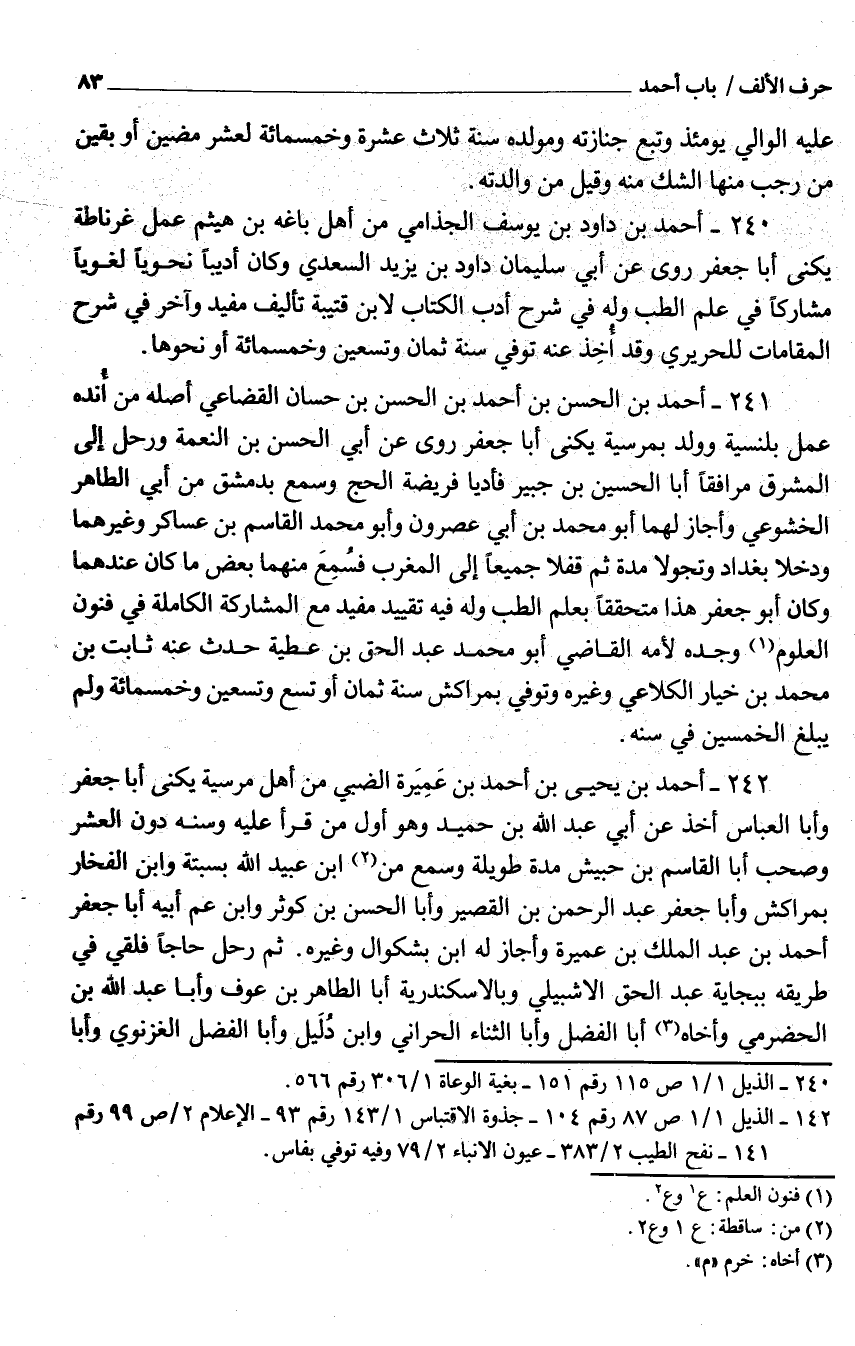 241 - أَحْمَد بْن الْحَسَن بْن أَحْمَد بْن الْحَسَن بْن حسان الْقُضَاعِي أَصله من أُنده عمل بلنسية وَولد بمرسية يكنى أَبَا جَعْفَر روى عَنْ أبي الْحَسَن بْن النِّعْمَة ورحل إِلَى الْمشرق مرافقًا أَبَا الْحُسَيْن بْن جُبَيْر فأديا فَرِيضَة الْحَج وَسمع بِدِمَشْق من أبي الطَّاهِر الخشوعي وَأَجَازَ لَهما أَبُو مُحَمَّد بْن أبي عصرون وَأَبُو مُحَمَّد القَاسِم بْن عَسَاكِر وَغَيرهمَا ودخلا بَغْدَاد وتجولا مدّة ثُمَّ قفلا جَمِيعًا إِلَى الْمغرب فسُمِعَ مِنْهُمَا بَعْض مَا كَانَ عِنْدهمَا وَكَانَ أَبُو جَعْفَر هَذَا متحققًا بِعلم الطِّبّ وَله فِيهِ تَقْيِيد مُفِيد مَعَ الْمُشَاركَة الْكَامِلَة فِي فنون الْعُلُوم وجده لأمه القَاضِي أَبُو مُحَمَّد عَبْد الْحق بْن عَطِيَّة حدَّث عَنْهُ ثَابت بْن مُحَمَّد بْن خِيَار الكلَاعِي وَغَيره وتُوُفيّ بمراكش سنة ثَمَان أَوْ تسع وَتِسْعين وَخَمْسمِائة وَلم يبلغ الْخمسين فِي سنه
