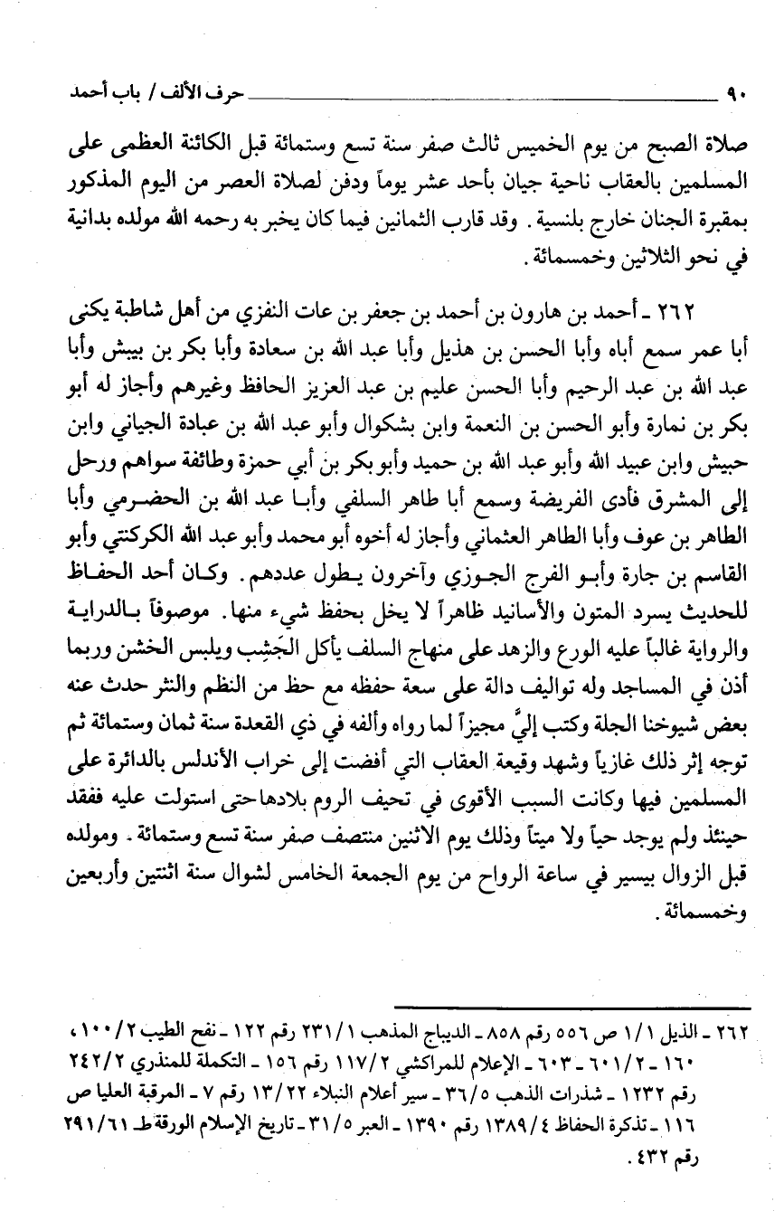 262 - أَحْمَد بْن هَارُون بْن أَحْمَد بْن جَعْفَر بْن عَاتٍ النفزي من أَهْلَ شاطبة يكنى أَبَا عمر سَمِعَ أَبَاهُ وَأَبا الْحَسَن بْن هُذَيْل وَأَبا عَبْد اللَّه بْن سَعَادَة وَأَبا بَكْر بْن بيبش وَأَبا عَبْد اللَّه بْن عَبْد الرَّحِيم وَأَبا الْحَسَن عليم بْن عبد الْعَزِيز الْحَافِظ وَغَيرهم وَأَجَازَ لَهُ أَبُو بَكْر بْن نمارة وَأَبُو الْحَسَن بْن النِّعْمَة وَابْن بشكوال وَأَبُو عبد الله بن عبَادَة الجياني وَابْن حُبَيْش وَابْن عُبَيْد اللَّه وَأَبُو عَبْد اللَّه بْن حُمَيْد وَأَبُو بَكْر بْن أبي حَمْزَة وَطَائِفَة سواهُم ورحل إِلَى الْمشرق فَأدى الْفَرِيضَة وَسمع أَبَا طَاهِر السِّلَفيّ وَأَبا عَبْد اللَّه بْن الحضْرميّ وَأَبا الطَّاهِر بْن عَوْف وَأَبا الطَّاهِر العثماني وَأَجَازَ لَهُ أَخُوهُ أَبُو مُحَمَّد وَأَبُو عَبْد اللَّه الكركنتي وَأَبُو القَاسِم بْن جَارة وَأَبُو الفَرَج الجَوْزِيّ وَآخَرُونَ يطول عَددهمْ وَكَانَ أحد الْحفاظ للْحَدِيث يسْرد الْمُتُون والأسانيد ظَاهرا لَا يخل بِحِفْظ شَيْءٍ مِنْهَا مَوْصُوفا بالدراية وَالرِّوَايَة غَالِبا عَلَيْهِ الْوَرع والزهد عَلَى منهاج السّلف يَأْكُل الجَشِب ويلبس الخشن وَرُبمَا أذن فِي الْمَسَاجِد وَله تواليف دَالَّة عَلَى سَعَة حفظه مَعَ حَظّ من النّظم والنثر حدَّث عَنْهُ بَعْض شُيُوخنَا الجلة وَكتب إِلَيّ مجيزا لما رَوَاهُ وألفه فِي ذِي الْقعدَة سنة ثَمَان وستّمائة ثُمَّ توجّه إِثْر ذَلِكَ غازيًا وَشهد وقيعة الْعقَاب الَّتِي أفضت إِلَى خراب الأندلس بالدائرة عَلَى الْمُسلمين فِيهَا وَكَانَت السَّبَب الْأَقْوَى فِي تحيف الرّوم بلادها حَتَّى استولت عَلَيْهِ ففقد حِينَئِذٍ وَلم يُوجد حَيا وَلَا مَيتا وَذَلِكَ يَوْمَ الِاثْنَيْنِ منتصف صَفَر سنة تسع وستّمائة ومولده قَبْلَ الزَّوَال بِيَسِير فِي سَاعَة الرواح من يَوْمَ الجُمُعَة الْخَامِس لشوال سنة اثْنَتَيْنِ وَأَرْبَعين وَخَمْسمِائة