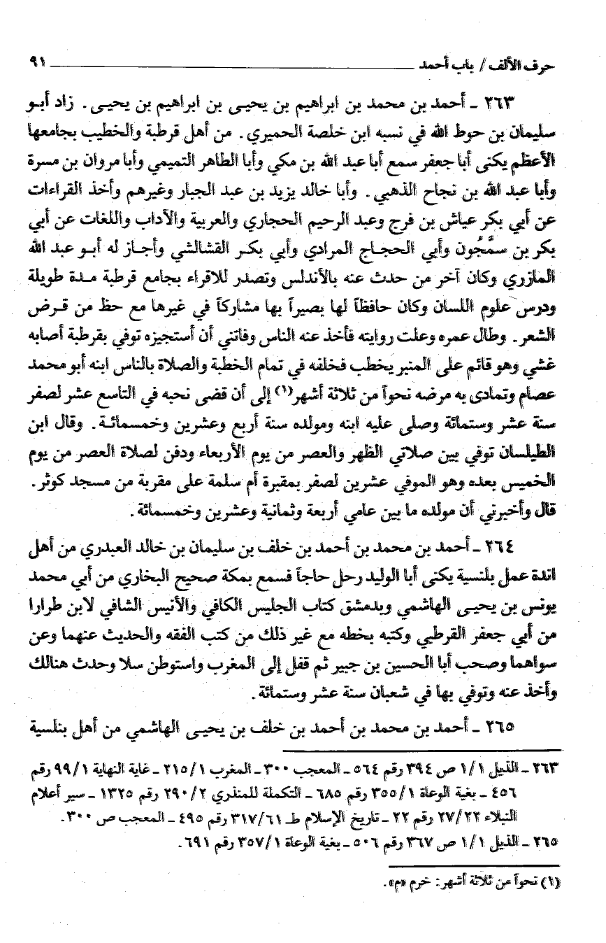 264 - أَحْمَد بْن مُحَمَّد بْن أَحْمَد بْن خَلَف بْن سُلَيْمَان بْن خَالِد الْعَبدَرِي من أَهْلَ أندة عمل بلنسية يكنى أَبَا الْوَلِيد رَحل حَاجا فَسمع بِمَكَّة صَحِيح من الْبُخَارِيّ من أبي مُحَمَّد يُونُس بْن يحيى الهاشميّ وبدمشق كتاب الجليس الْكَافِي والأنيس الشافي لِابْنِ طرارا من أبي جَعْفَر القُرْطُبيّ وَكتبه بِخَطِّهِ مَعَ غَيْر ذَلِكَ من كتب الْفِقْه والْحَدِيث عَنْهُمَا وَعَن سواهُمَا وَصَحب أَبَا الْحُسَيْن بْن جُبَيْر ثُمَّ قفل إِلَى الْمغرب واستوطن سلا وَحدث هُنَالك وَأخذ عَنهُ وَتُوفِّي بهَا فِي شعْبَان سنة عَشْر وستّمائة