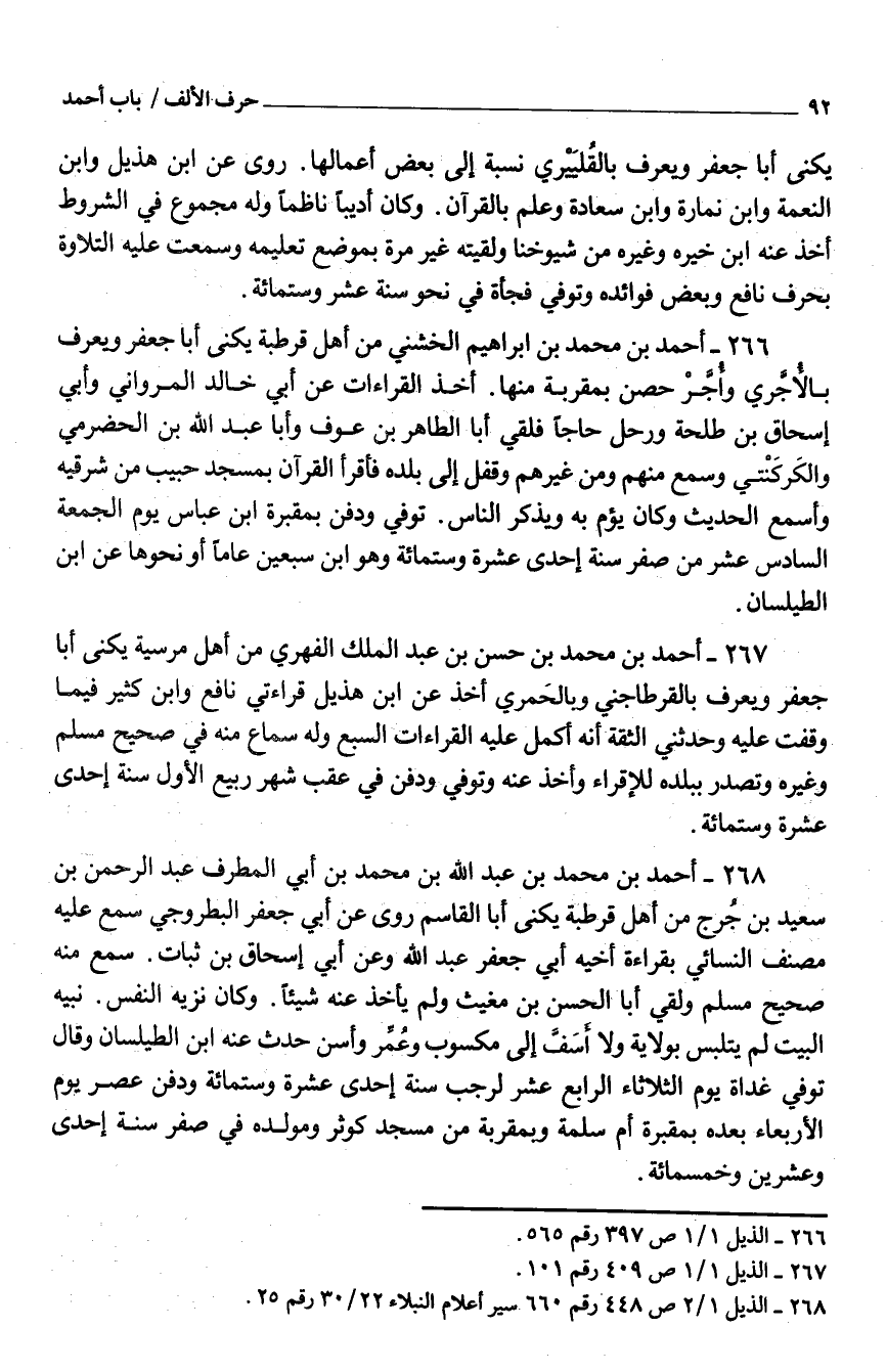 267 - أَحْمَد بْن مُحَمَّد بْن حَسَن بْن عَبْد الْملك الفِهري من أَهْلَ مرسية يكنى أَبَا جَعْفَر وَيعرف بالقرطاجني وبالحَمري أَخذ عَنِ ابْن هُذَيْل قراءتي نَافِع وَابْن كثير فِيمَا وقفت عَلَيْهِ وحَدثني الثِّقَة أَنَّهُ أكمل عَلَيْهِ الْقرَاءَات السَّبع وَله سَماع مِنْهُ فِي صَحِيح مُسْلِم وَغَيره وتصدر بِبَلَدِهِ للإقراء وَأخذ عَنْهُ وتُوُفيّ ودُفِن فِي عقب شهر ربيع الأوّل سنة إِحْدَى عشرَة وستّمائة