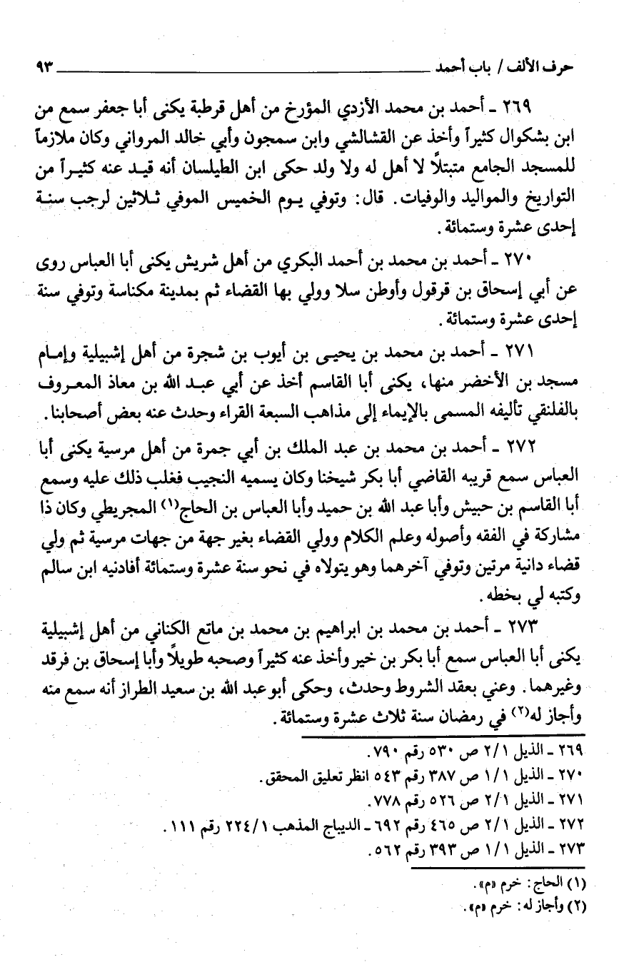 269 - أَحْمَد بْن مُحَمَّد الْأَزْدِيّ المؤرخ من أَهْلَ قرطبة يكنى أَبَا جَعْفَر سَمِعَ من ابْن بشكوال كثيرا وَأخذ عَنِ القشالشي وَابْن سمجون وَأبي خَالِد المرواني وَكَانَ ملازمًا لِلْمَسْجِدِ الْجَامِع متبتلاً لَا أَهْلَ لَهُ وَلَا وُلِدَ حكى ابْن الطيلسان أَنَّهُ قيد عَنْهُ كثيرا من التواريخ والمواليد والوفيات قَالَ وَتُوفِّي يَوْمَ الْخَمِيس الموفي ثَلَاثِينَ لرجب سنة إِحْدَى عشرَة وستّمائة