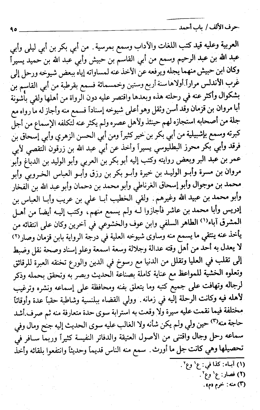 الْعَرَبيَّة وَعَلِيهِ قَيد كتب اللُّغَات والآداب وَسمع بمرسية من أبي بَكْر بْن أبي ليلى وَأبي عَبْد اللَّه بْن عَبْد الرَّحِيم وَسمع من أبي القَاسِم بْن حُبَيْش وَأبي عَبْد اللَّه بْن حُمَيْد يَسِيرا وَكَانَ ابْن حُبَيْش مِنْهُمَا بجله وَيَرْفَعهُ عَنِ الْأَخْذ عَنْهُ لمساواته إِيَّاه بِبَعْض شُيُوخه ورحل إِلَى غرب الأندلس مرَارًا أولاها سنة أَربع وَسِتِّينَ وَخَمْسمِائة فَسمع بقرطبة من أبي القَاسِم بْن بشكوال وَأكْثر عَنْهُ فِي رحلته هَذِهِ وَبعدهَا وَاقْتصر عَلَيْهِ دون الروَاة من أَهلهَا وَلَقي بأشونة أَبَا مَرْوَان بْن قزمان وَقد أسن وَثقل وَهُوَ أَعلَى شُيُوخه إِسْنَادًا فَسمع مِنْهُ وَأَجَازَ لَهُ مَا رَوَاهُ مَعَ جلة من أَصْحَابه استجازه لَهُم حِينَئِذٍ وَلأَهل عصره وَلم يكثر عَنْهُ لتكلفه الإسماع من أَجْلِ كبرته وَسمع بإشبيلية من أبي بَكْر بْن خَيّر كثيرا وَمن أبي الْحَسَن الزُّهْرِيّ وَأبي إِسْحَاق بْن فرقد وَأبي بَكْر مُحرز البطليوسي يَسِيرا وَأخذ عَنْ أبي عَبْد اللَّه بْن زرقون التَّقَصِّي لأبي عُمَر بْن عَبْد الْبر وَبَعض رِوَايَته وَكتب إِلَيْهِ أَبُو بَكْر بْن الْعَرَبِيّ وَأَبُو الْوَلِيد بْن الدّباغ وَأَبُو مَرْوَان بْن مَسَرَّة وَأَبُو الْوَلِيد بْن خيرة وَأَبُو بَكْر بْن رزق وَأَبُو الْعَبَّاس الخروبي وَأَبُو مُحَمَّد بْن موجوال وَأَبُو إِسْحَاق الغرناطي وَأَبُو مُحَمَّد بْن دحمان وَأَبُو عَبْد اللَّه بْن الفخار وَأَبُو مُحَمَّد بْن عُبَيْد اللَّه وَغَيرهم وَلَقي الْخَطِيب أَبَا عَلِيّ بْن عريب وَأَبا الْعَبَّاس بْن إِدْرِيس وَأَبا مُحَمَّد بْن عَاشر فأجازوا لَهُ وَلم يسمع مِنْهُم وَكتب إِلَيْهِ أَيْضا من أَهْلَ الْمشرق آبَاء الطَّاهِر السِّلَفيّ وَابْن عَوْف والخشوعي فِي آخَرين وَكَانَ عَلَى انتقائه من يَأْخُذ عَنْهُ ينتقي مَا يسمع مِنْهُ وساوي شُيُوخه الْعلية فِي دَرَجَة الرِّوَايَة بِابْن قزمان وَصَارَ لَا يعدل بِهِ أحد من أهل وقته عَدَالَة وجلالة وسعة اسمعة وعلو إِسْنَاد وَصِحَّة نقل وَضبط إِلَى تقلب فِي الْعليا وتقلل من الدُّنْيَا مَعَ رسوخ فِي الدِّين والورع تخنقه الْعبْرَة للرقائق وتعلوه الخشية للمواعظ مَعَ عناية كَامِلَة بصناعة الحَدِيث وبصر بِهِ وَتحقّق بِحمْلِهِ وَذَكَرَ لرجاله وتهافت عَلَى جَمِيع كتبه وَمَا يتَعَلَّق بفنه ومحافظة عَلَى إسماعه ونشره وترغيب لأَهله فِيهِ وَكَانَت الرحلة إِلَيْهِ فِي زَمَانه وَولي الْقَضَاء بيلنسية وشاطبة حقبا عدَّة وأوقاتا مُخْتَلفَة فِيمَا نقمت عَلَيْهِ سيرة وَلَا وَقعت بِهِ استرابة سوى حِدة متعارفة مِنْهُ ثُمَّ صرف أَشد حَاجَة مِنْهُ حِين وُلّي وَلم يكن شَأْنه وَلَا الْغَالِب عَلَيْهِ سوى الحَدِيث إِلَيْهِ جنح وَمَال وَفِي سَمَاعه رَحل وجال واقتنى من الْأُصُول العتيقة والدفاتر النفيسة كثيرا وَرُبمَا سَافر فِي تَحْصِيلهَا وَهِي كَانَتْ جلّ مَا أورث سَمِعَ مِنْهُ النّاس قَدِيما وحديثًا وانتفعوا بلقائه وَأخذ