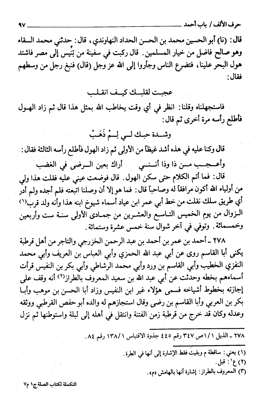قَالَ نَا أَبُو الْحُسَيْن مُحَمَّد بْن الْحَسَن الْحداد النهاوندي قَالَ حَدَّثَنِي مُحَمَّد السقاء وَهُوَ صَالح فَاضل من خِيَار الْمُسلمين قَالَ ركبت فِي سفينة من تِنِّيس إِلَى مصر فَاشْتَدَّ هول الْبَحْر عَلَيْنَا فتضرع النّاس وجأروا إِلَى اللَّه عَزَّ وَجَلَّ قَالَ فنبغ رَجُل من وَسطهمْ فَقَالَ