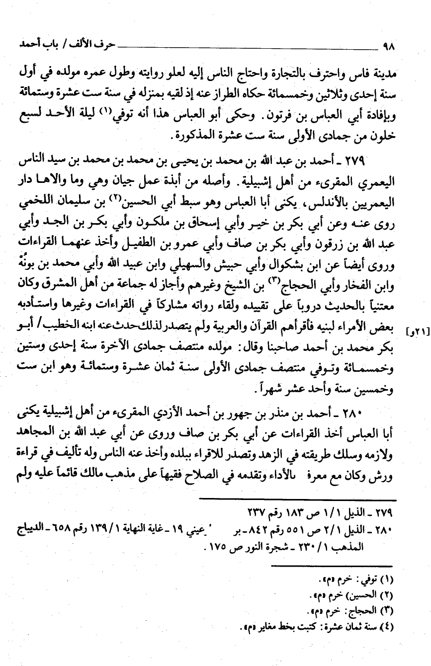 280 - أَحْمَد بْن مُنْذر بْن جهور بن أَحْمد الْأَزْدِيّ المقرىء من أَهْلَ إشبيلية يكنى أَبَا الْعَبَّاس أَخذ الْقرَاءَات عَنْ أبي بَكْر بْن صَاف وروى عَنْ أبي عَبْد اللَّه بْن الْمُجَاهِد ولازمه وسلك طَرِيقَته فِي الزّهْد وتصدر للإقراء بِبَلَدِهِ وَأخذ عَنْهُ النّاس وَله تأليف فِي قِرَاءَة ورش وَكَانَ مَعَ معرفَة بِالْأَدَاءِ وتقدمه فِي الصّلاح فَقِيها عَلَى مَذْهَب مَالك قَائِما عَلَيْهِ وَلم