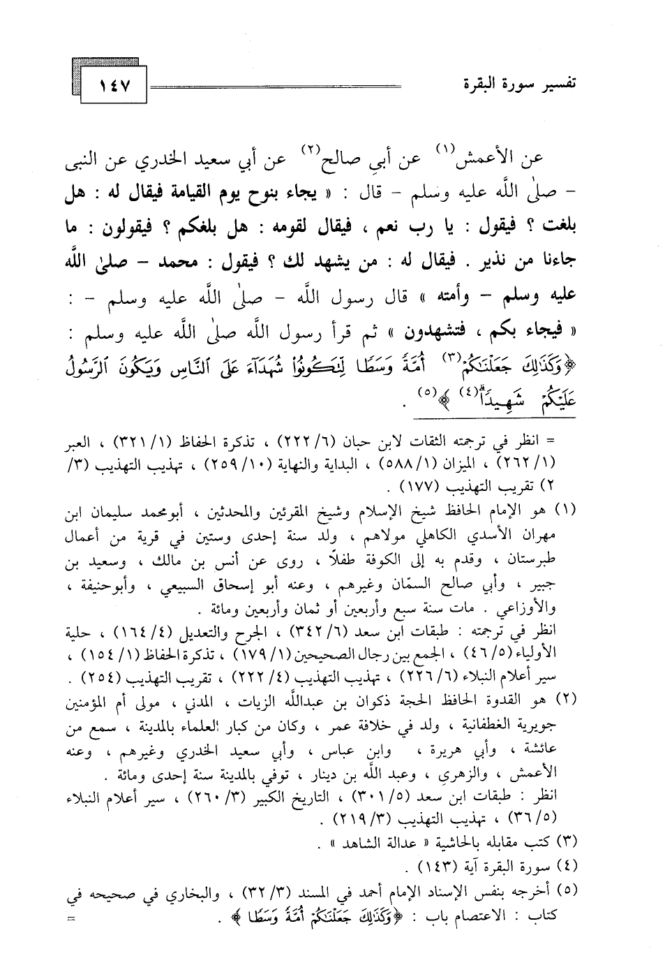 عن الأعمش عن أبي صالح عن أبي سعيد الخدري عن النبي - صلى الله عليه وسلم -: " يجاء بنوح يوم القيامة فيقال له: هل بلغت، فيقول: يا رب نعم، فيقال لقومه: هل بلغكم، فيقولون: ما جاءنا من نذير. فيقال له: من يشهد لك، فيقول: محمد - صلي الله عليه وسلم - وأمته، قال رسول الله - صلى الله عليه وسلم -: " فيجاء بكم، فتشهدون " ثم قرأ رسول الله صلى الله عليه وسلم: (وَكَذَلِكَ جَعَلْنَاكُمْ أُمَّةً وَسَطًا لِتَكُونُوا شُهَدَاءَ عَلَى النَّاسِ وَيَكُونَ الرَّسُولُ عَلَيْكُمْ شَهِيدًا) .