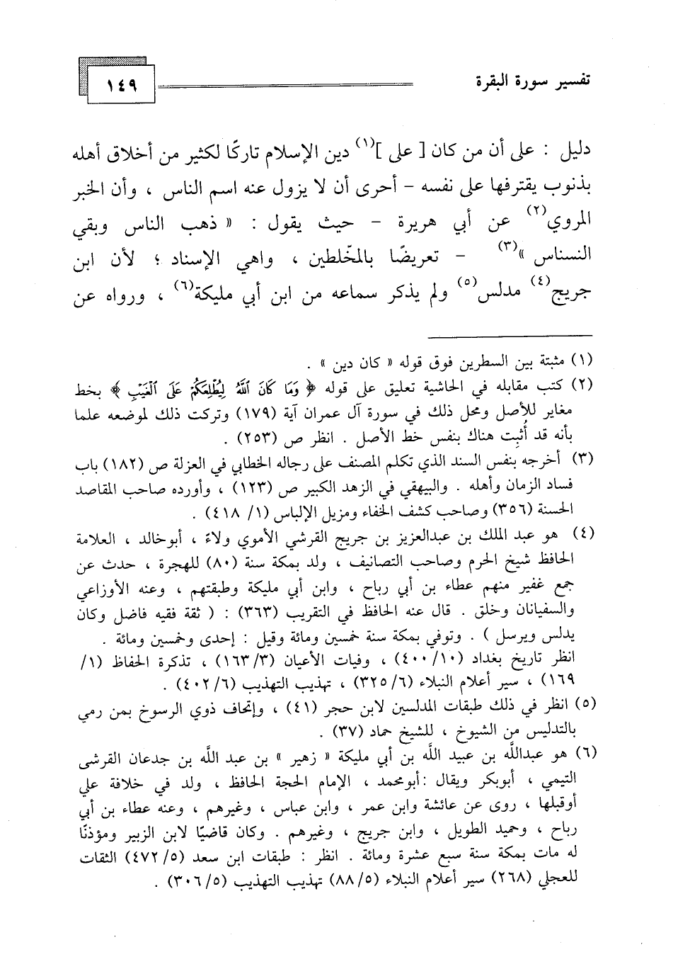 دليل: على أن من كان على دين الإسلام تاركا لكثير من أخلاق أهله بذنوب يقترفها على نفسه - أحرى أن لا يزول عنه اسم الناس، وأن الخبر المروي عن أبي هريرة - حيث يقول: " ذهب الناس وبقي النسناس " - تعريضا بالمخلطين، واهي الإسناد، لأن ابن جريج مدلس ولم يذكر سماعه من ابن أبي مليكة، ورواه عن