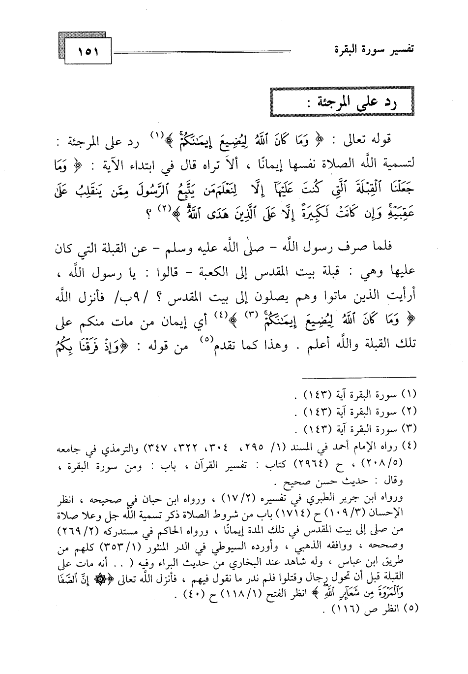 رد على المرجئة: لتسمية الله الصلاة نفسها إيمانا، ألا تراه قال في ابتداء الآية: (وَمَا جَعَلْنَا الْقِبْلَةَ الَّتِي كُنْتَ عَلَيْهَا إِلَّا لِنَعْلَمَ مَنْ يَتَّبِعُ الرَّسُولَ مِمَّنْ يَنْقَلِبُ عَلَى عَقِبَيْهِ وَإِنْ كَانَتْ لَكَبِيرَةً إِلَّا عَلَى الَّذِينَ هَدَى اللَّهُ) .