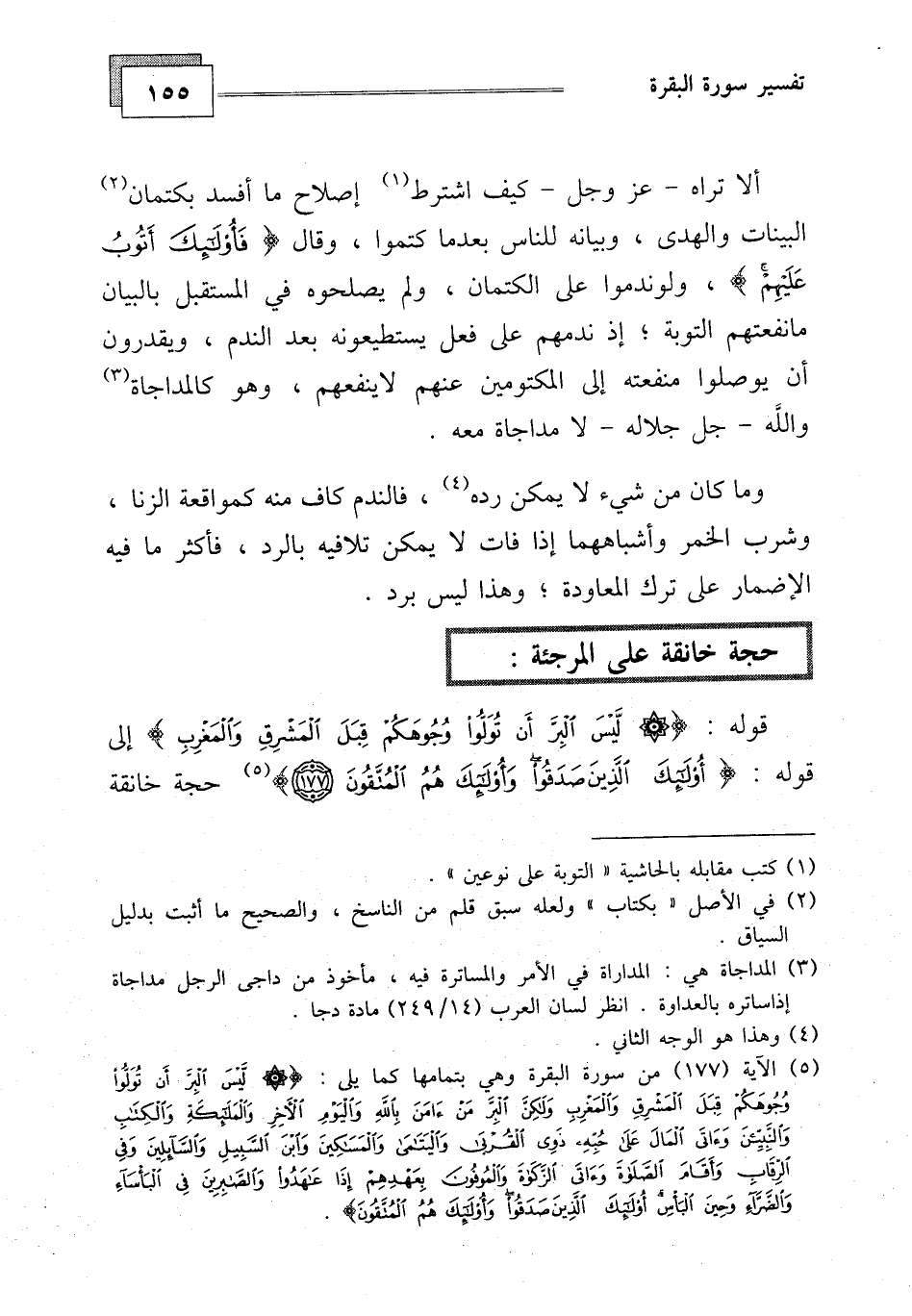 ألا تراه - عز وجل - كيف اشترط إصلاح ما أفسد بكتمان البينات والهدى، وبيانه للناس بعدما كتموا، وقالت (فَأُولَئِكَ أَتُوبُ عَلَيْهِمْ) ، ولوندموا على الكتمان، ولم يصلحوه في المستقبل بالبيان ما نفعتهم التوبة، إذ ندمهم على فعل يستطيعونه بعد الندم، ويقدرون أن يوصلوا منفعته إلى المكتومين عنهم لا ينفعهم، وهو كالمداجاة (1) والله - جل جلاله - لا مداجاة معه.