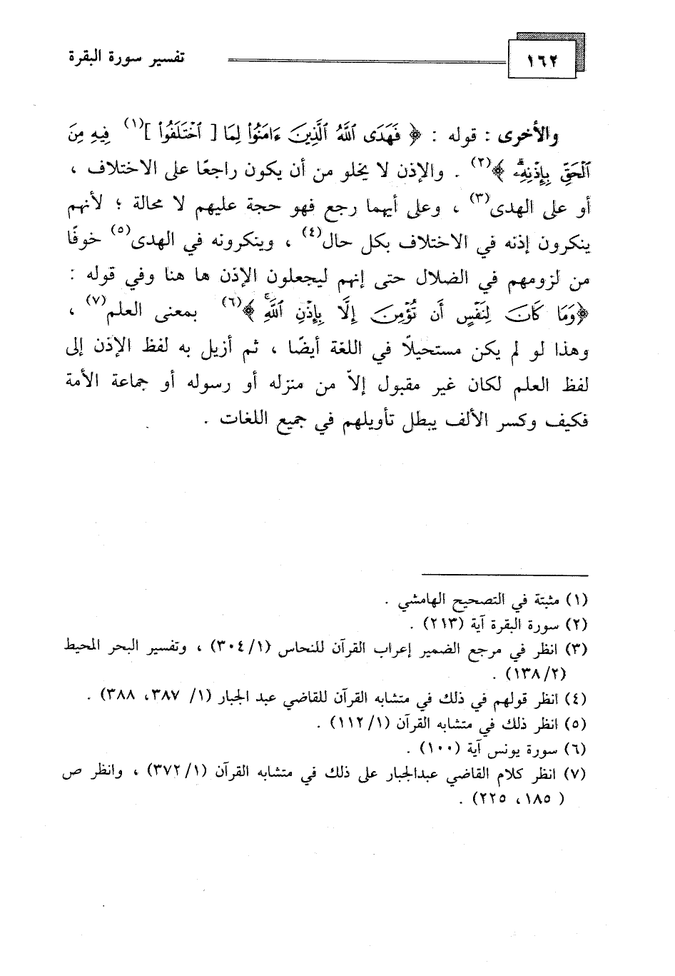 والأخرى: قوله (فَهَدَى اللَّهُ الَّذِينَ آمَنُوا لِمَا اخْتَلَفُوا فِيهِ مِنَ الْحَقِّ بِإِذْنِهِ) والإذن لا يخلو من أن يكون راجعا على الاختلاف، أو على الهدى، وعلى أيهما رجع فهو حجة عليهم لا محالة، لأنهم ينكرون إذنه في الاختلاف بكل حال، وينكرونه في الهدى خوفا من لزومهم في الضلالة حتى إنهم ليجعلون الإذن هاهنا وفي قوله: (وَمَا كَانَ لِنَفْسٍ أَنْ تُؤْمِنَ إِلَّا بِإِذْنِ اللَّهِ) بمعنى العلم، وهذا لو لم يكن مستحيلا في اللغة أيضا، ثم أزيل به لفظ الإذن إلى لفظ العلم لكان غير مقبول إلا من منزله أو رسوله أو جماعة الأمة وكيف وكسر الألف يبطل تأويلهم في جميع اللغات.