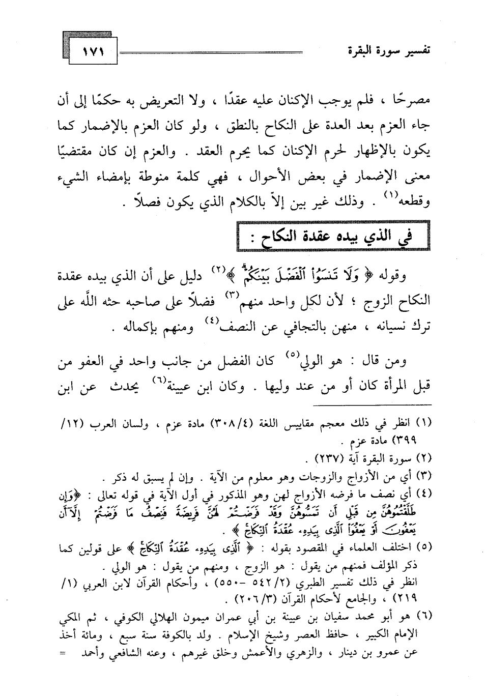 مصرحا، فلم يوجب الإكنان عليه عقدا، ولا التعريض به حكما إلى أن جاء العزم بعد العدة على النكاح بالنطق، ولو كان العزم بالإضمار كما يكون بالإظهار لحرم الإكنان كما يحرم العقد. والعزم إن كان مقتضبا معنى الإضمار في بعض الأحوال، فهي كلمة منوطة بإمضاء الشيء وقطعها أي. وذلك غير بين إلا بالكلام الذي يكون فصلاً