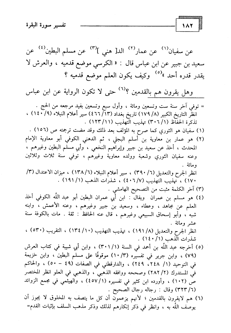 عن سفيان عن عمار الدهني، عن مسلم البطين عن سعيد بن جبير عن ابن عباس قال: " الكرسي موضع قدميه، والعرش لا يقدر قدره أحد " وكيف يكون العلم موضع قدميه،