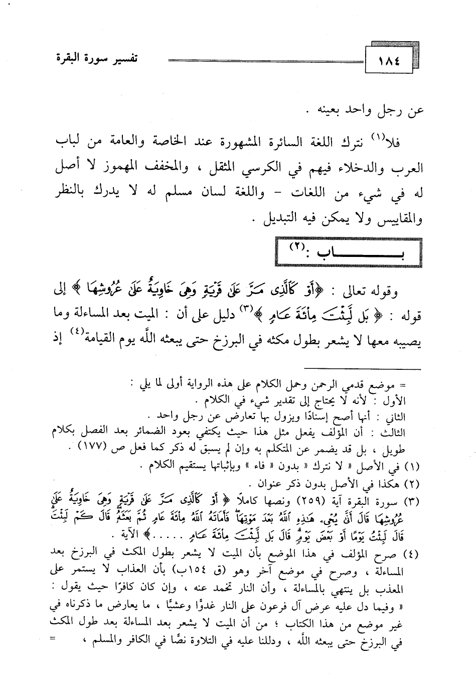 وقوله تعالى: (أَوْ كَالَّذِي مَرَّ عَلَى قَرْيَةٍ وَهِيَ خَاوِيَةٌ عَلَى عُرُوشِهَا)