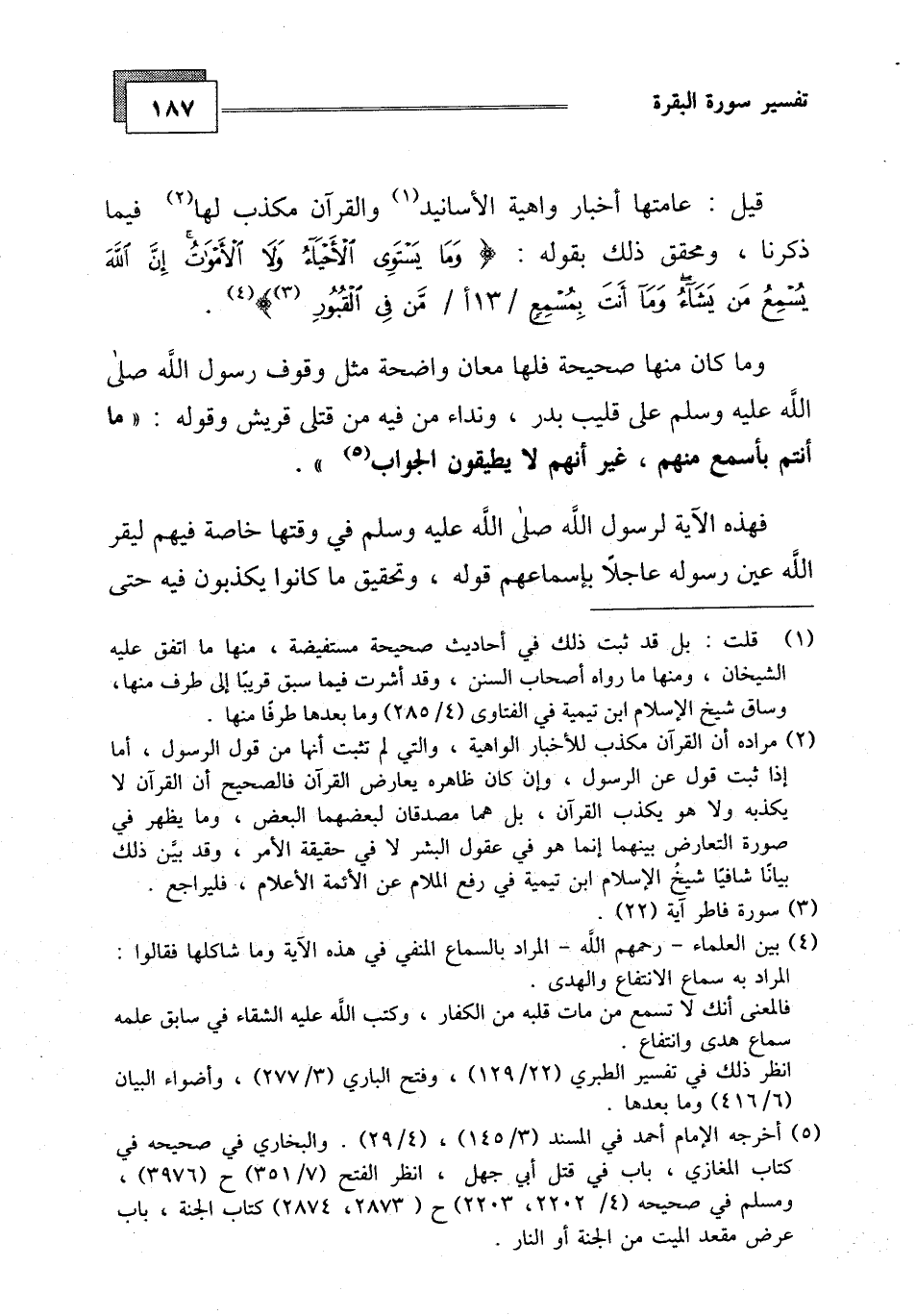 الله عليه وسلم على قليب بدر، ونداء من فيه من قتلى قريش وقوله: " ما أنتم لأسمع منهم، غير أنهم لا يطيقون الجواب.