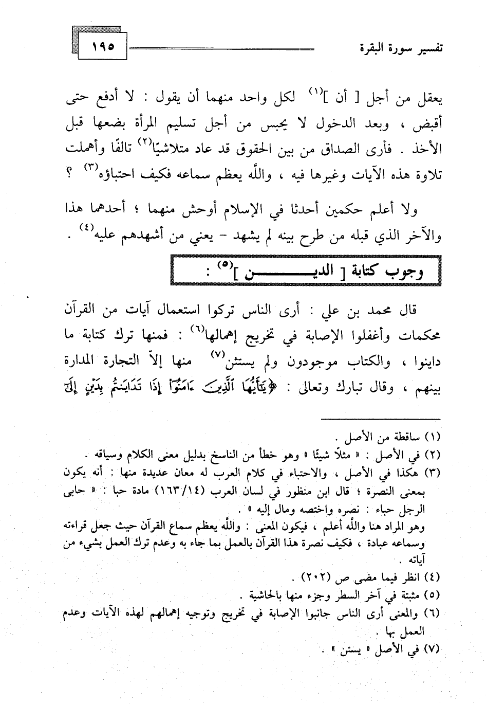 قال محمد بن علي: أرى الناس تركوا استعمال آيات من القرآن محكمات وأغفلوا الإصابة في تخريج إهمالها: فمنها ترك كتابة ما داينوا، والكتاب موجودون ولم يستثن منها إلي التجارة المدارة بينهم، وقالت تبارك وتعالى: (يَا أَيُّهَا الَّذِينَ آمَنُوا إِذَا تَدَايَنْتُمْ بِدَيْنٍ إِلَى أَجَلٍ مُسَمًّى فَاكْتُبُوهُ وَلْيَكْتُبْ بَيْنَكُمْ كَاتِبٌ بِالْعَدْلِ)