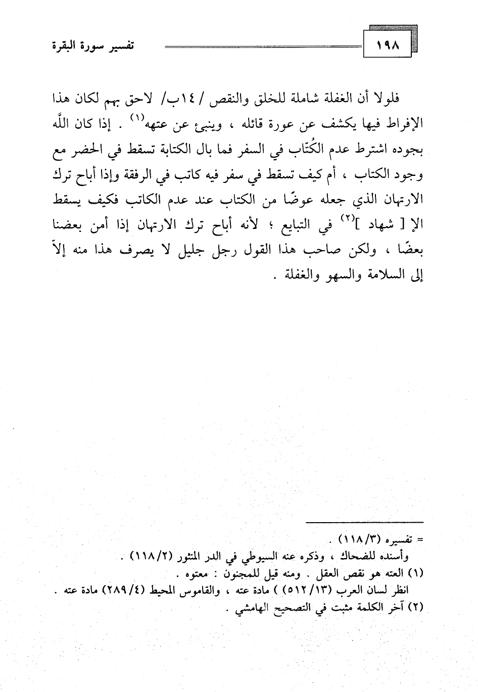 فلولا أن الغفلة شاملة للخلق والنقص لاحق بهم لكان هذا الإفراط فيها يكشف عن عورة قائله، وينبئ عن عتهه. إذا كان الله بجوده اشترط عدم الكتاب في السفر فما بال الكتابة تسقط في الحضر مع وجود الكتاب، أم كيف تسقط في سفر فيه كاتب في الرفقة وإذا أباح ترك الارتهان الذي جعله عن ما من الكتاب عند عدم الكاتب فكيف يسقط الإشهاد في التباين، لأنه أباح ترك الارتهان إذا أمن بعضنا بعضا، ولكن صاحب هذا القول رجل جليل لا يصرف هذا منه إلا إلى السلامة والسهو والغفلة
