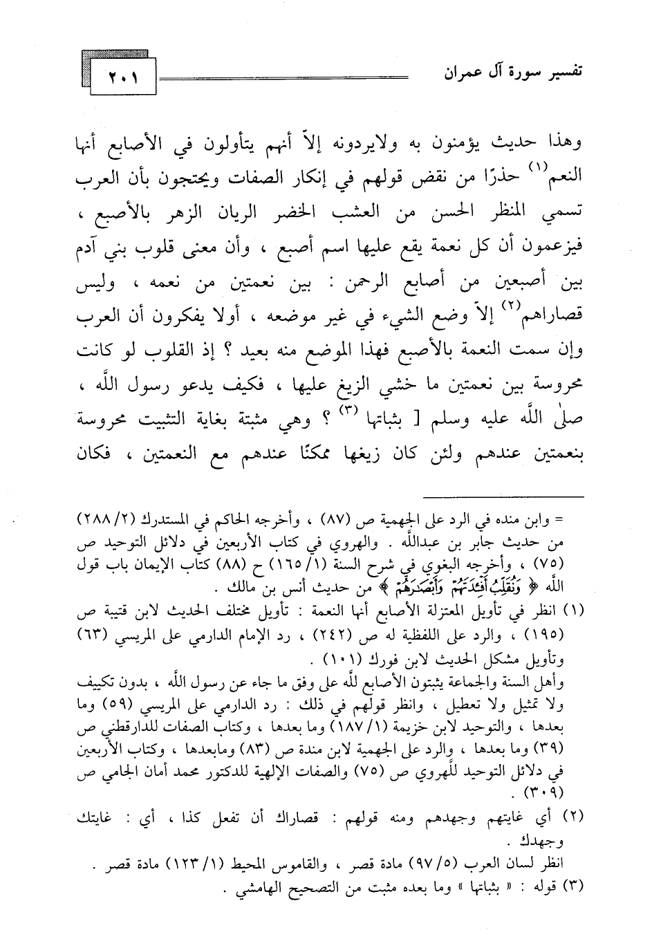 وهذا حديث يؤمنون به ولا يردونه إلا أنهم يتأولون في الأصابع أنها النعم حذرا من نقض قولهم في إنكار الصفات ويحتجون بأن العرب تسمي المنظر الحسن من العشب الخضر الريان الزهر بالأصبع، فيزعمون أن كل نعمة يقع عليها اسم أصبع، وأن معنى قلوب بني آدم بين أصبعين من أصابع الرحمن: بين نعمتين من نعمه، وليس قصاراهم إلا وضع الشيء في غير موضعه، أولا يفكرون أن العرب وإن سمت النعمة بالأصبع فهذا الموضع منه بعيد؛ إذ القلوب لو كانت محروسة بين نعمتين ما خشي الزيغ عليها، فكيف يدعو رسول الله، صلى الله عليه وسلم بثباتها، وهي مثبتة بغاية التثبيت محروسة بنعمتين عندهم ولئن كان زيغها ممكنا عندهم مع النعمتين، فكان