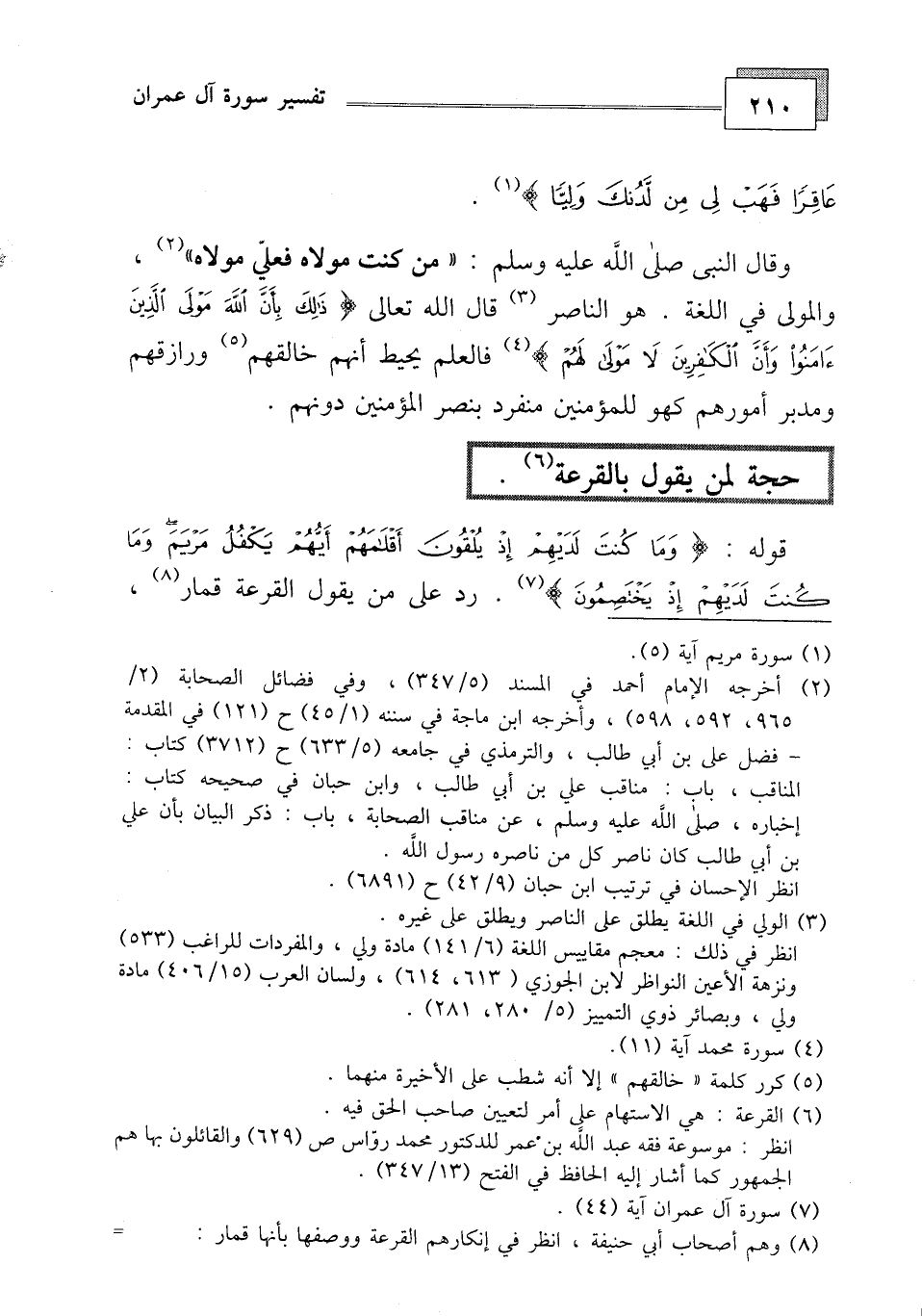 وقال النبي صلى الله عليه وسلم: " من كنت مولاه فعلي مولاه، والمولى في اللغة. هو الناصر قال الله تعالى (ذَلِكَ بِأَنَّ اللَّهَ مَوْلَى الَّذِينَ آمَنُوا وَأَنَّ الْكَافِرِينَ لَا مَوْلَى لَهُمْ (11)